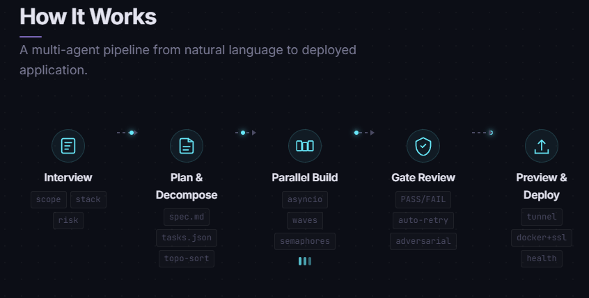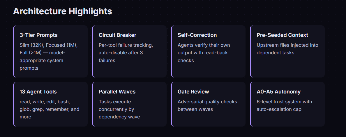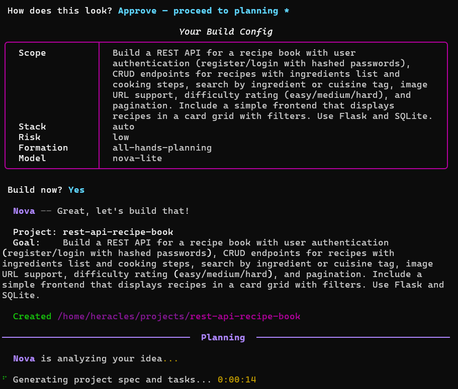 Nova models would describe code instead of writing it — we traced this to missing tool-use instructions in the agent prompts. Files landed in src/ instead of the project root. The decomposer stripped technical detail from tasks, causing models to hallucinate frameworks. The verify phase triggered too early, killing multi-file builds. Each bug required tracing through the full pipeline to find the root cause.
