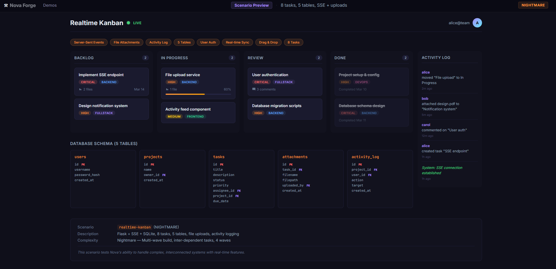 Nova Forge turns a single English prompt into a deployed application. Type "build a tower defense game with 6 tower types" and Nova agents plan the architecture, decompose it into tasks, execute them in parallel waves, run adversarial quality reviews, and deploy to a live URL. 9 playable game demos — from simple arcade to pseudo-3D racing — all built by Nova with zero human code.