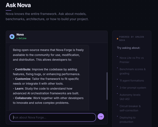 We watched developers spend hours on boilerplate — scaffolding projects, wiring APIs, debugging CSS. What if you could just describe what you want and an AI builds the whole thing? Amazon Nova's 3-tier model family (Lite/Pro/Premier) gave us the perfect playground: one framework, three capability levels, real production output.