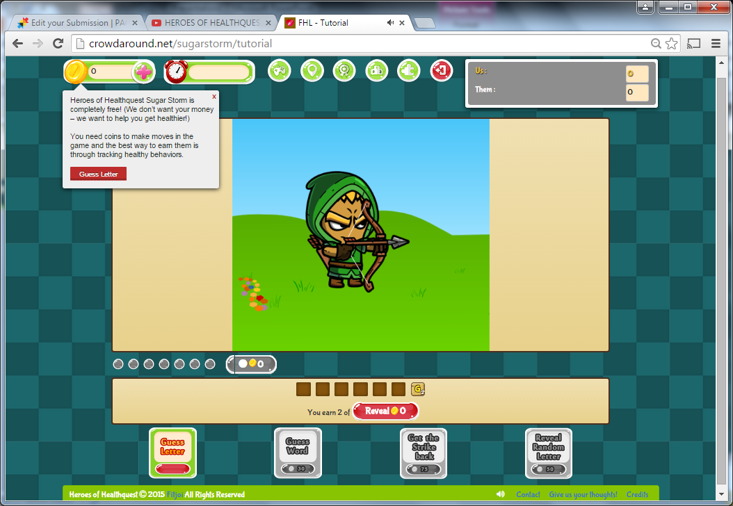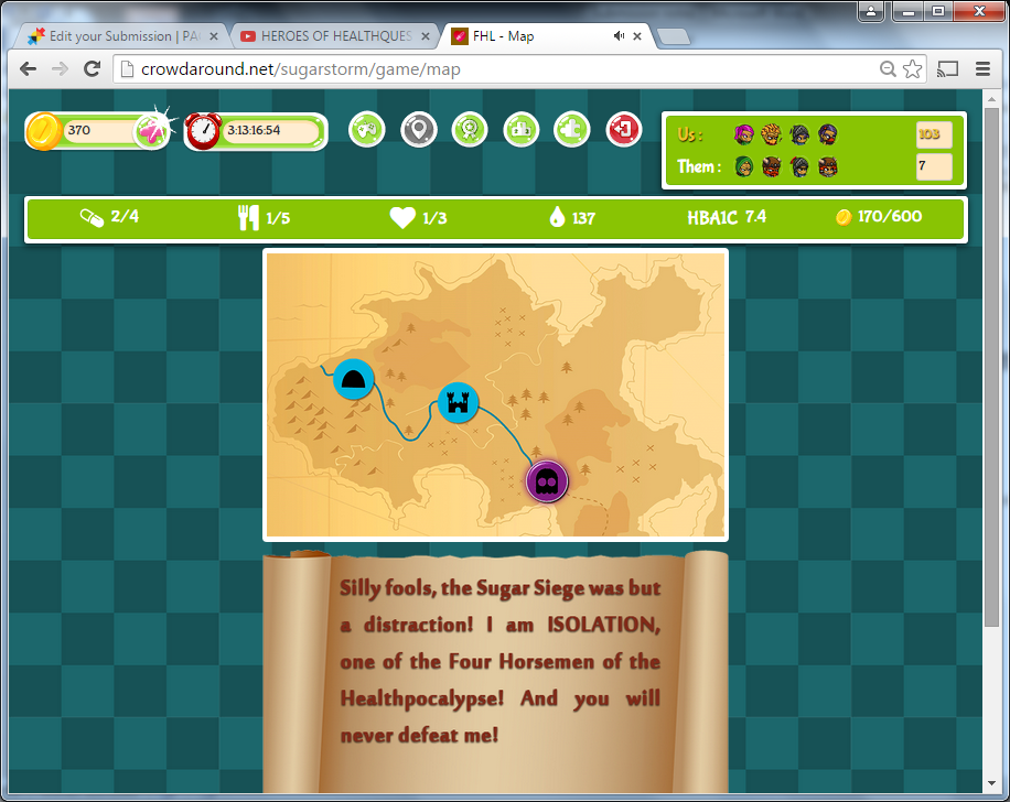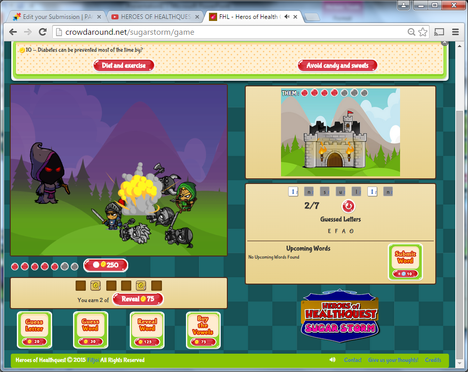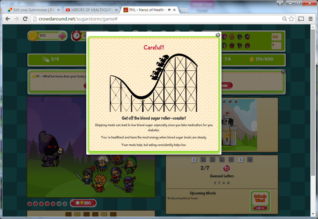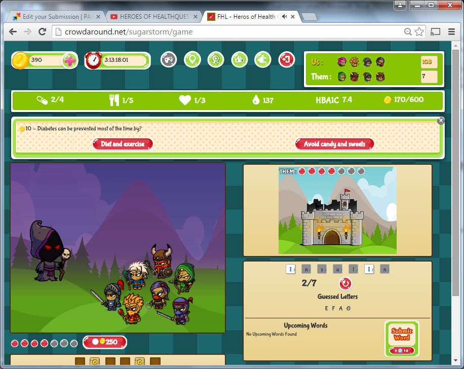 In Heroes of Healthquest, players embark on a journey to save Healthalot from the Four Horsemen of the Healthpocalypse (Isolation, Apathy, Denial, and Ignorance). They play in teams battling through word puzzles using coins to make moves and unlock special features. However, to earn coins, diabetics track healthy behaviors that reinforce their doctor’s recommendations and follow clinical guidelines, such as diabetic medications, carbohydrate consumption, heart medications, blood sugar and HbA1c. Non-diabetic friends and family can play alongside diabetics by choosing healthy behaviors to track such as exercise, medications, sleep, smoking, etc., which creates a supportive team and accountability. Additionally, diabetics are aided through educational alerts and warnings when bad behaviors are logged, supplemental healthy activities, called HealthTreks, and diabetic mini-quiz educational touchpoints.