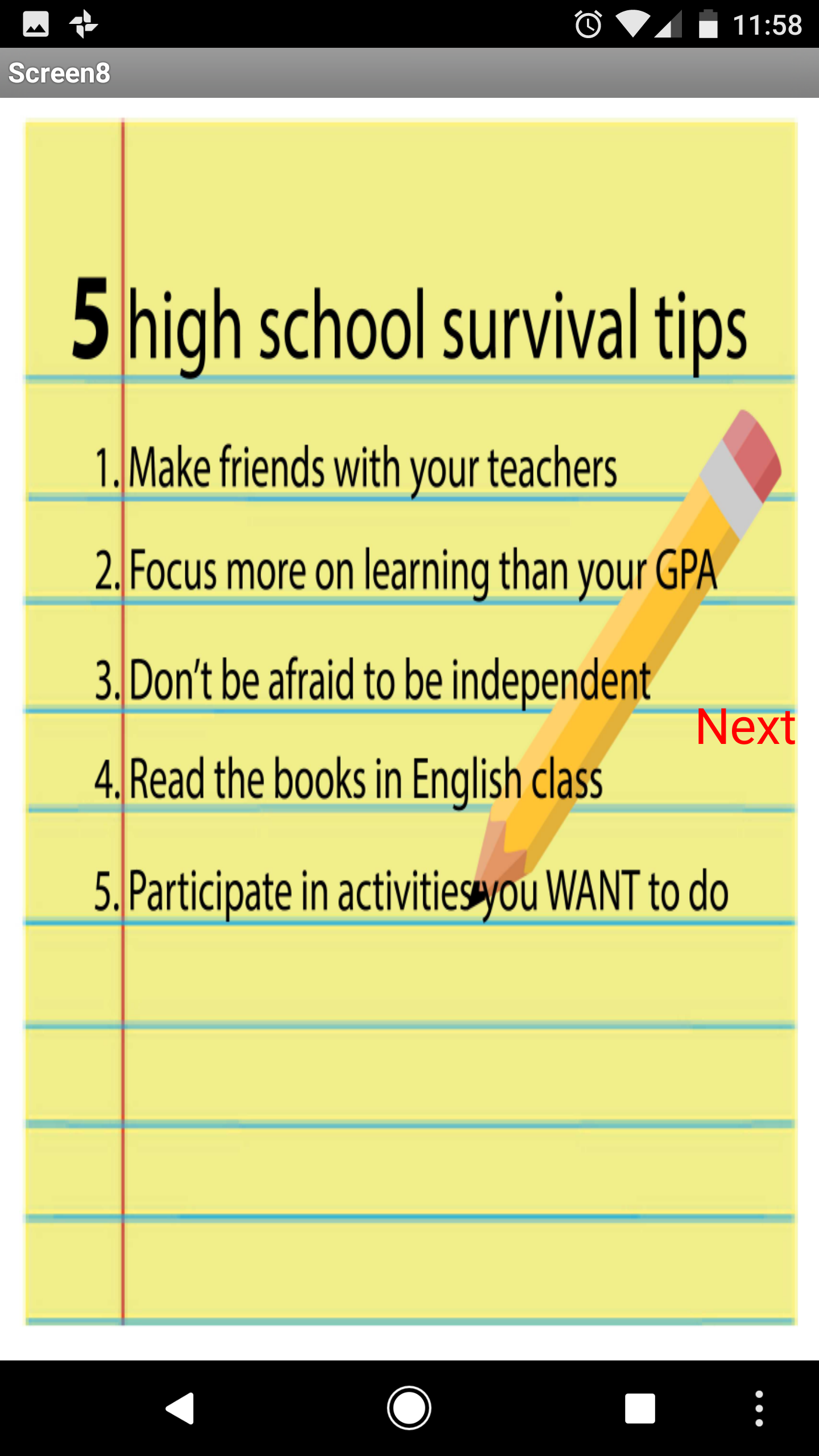 There are a lot of ways to improve the High School Survival Guide app. We can start by expanding the schools section around the entire country instead of just focusing on our community. Also we can add a schedule for students to plan their days and learn how to properly manage their time wisely. Finally, we can provide and add so much more information that we feel it'll improve our app.