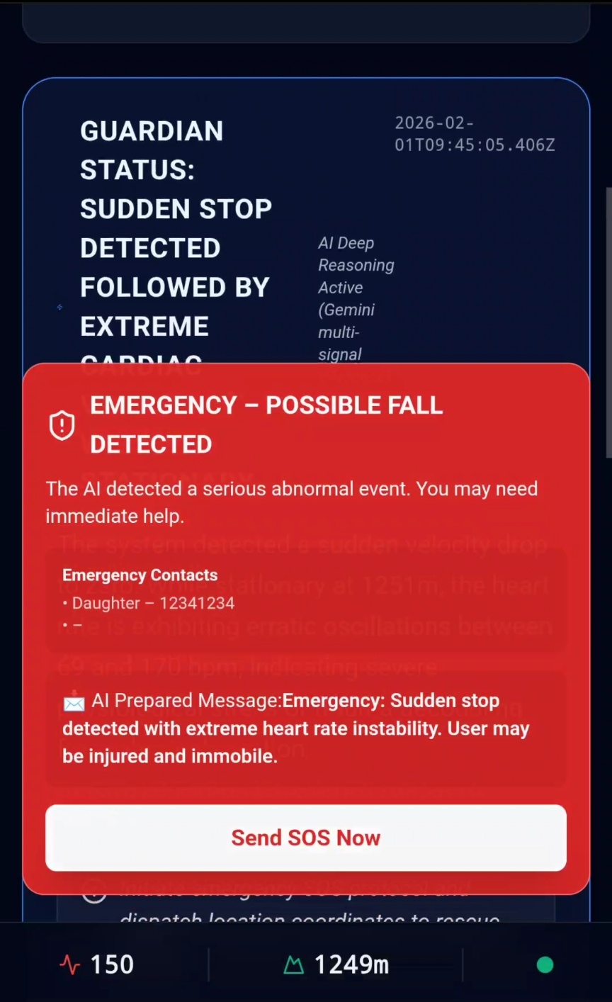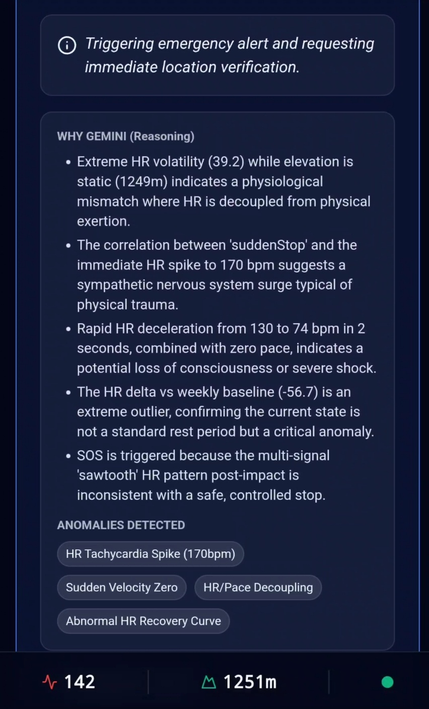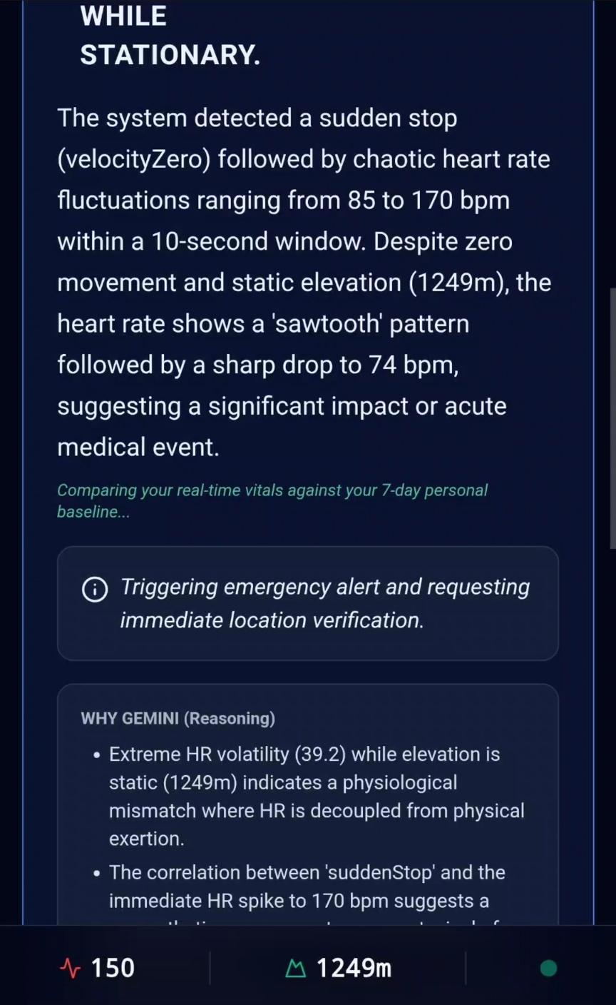 Gemini detects sudden stop + chaotic HR fluctuations, triggering deep-reasoning safety analysis before SOS activation.