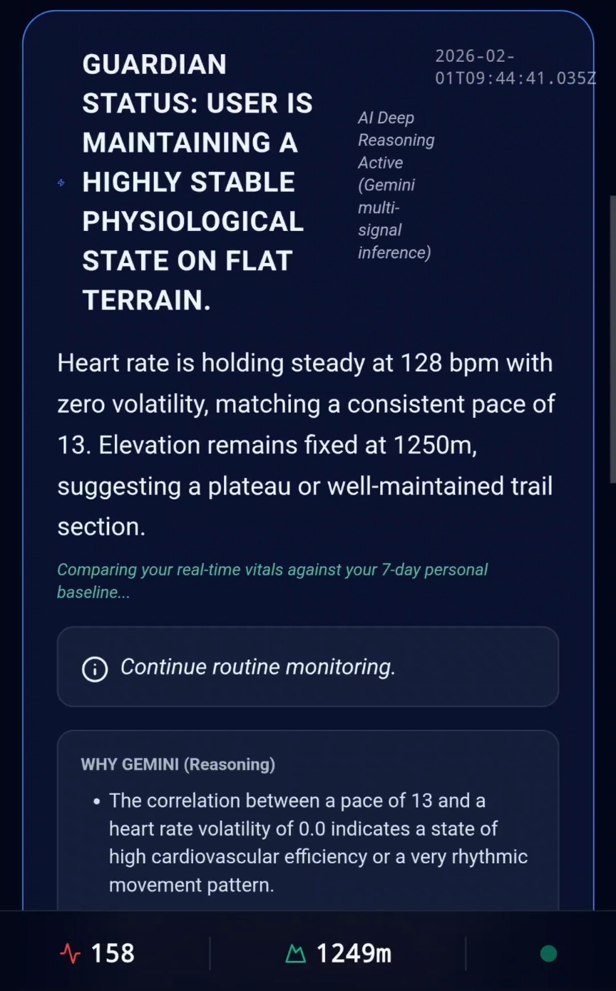 Stable physiological state detected: zero HR volatility and consistent pace with Gemini deep-reasoning monitoring engaged.