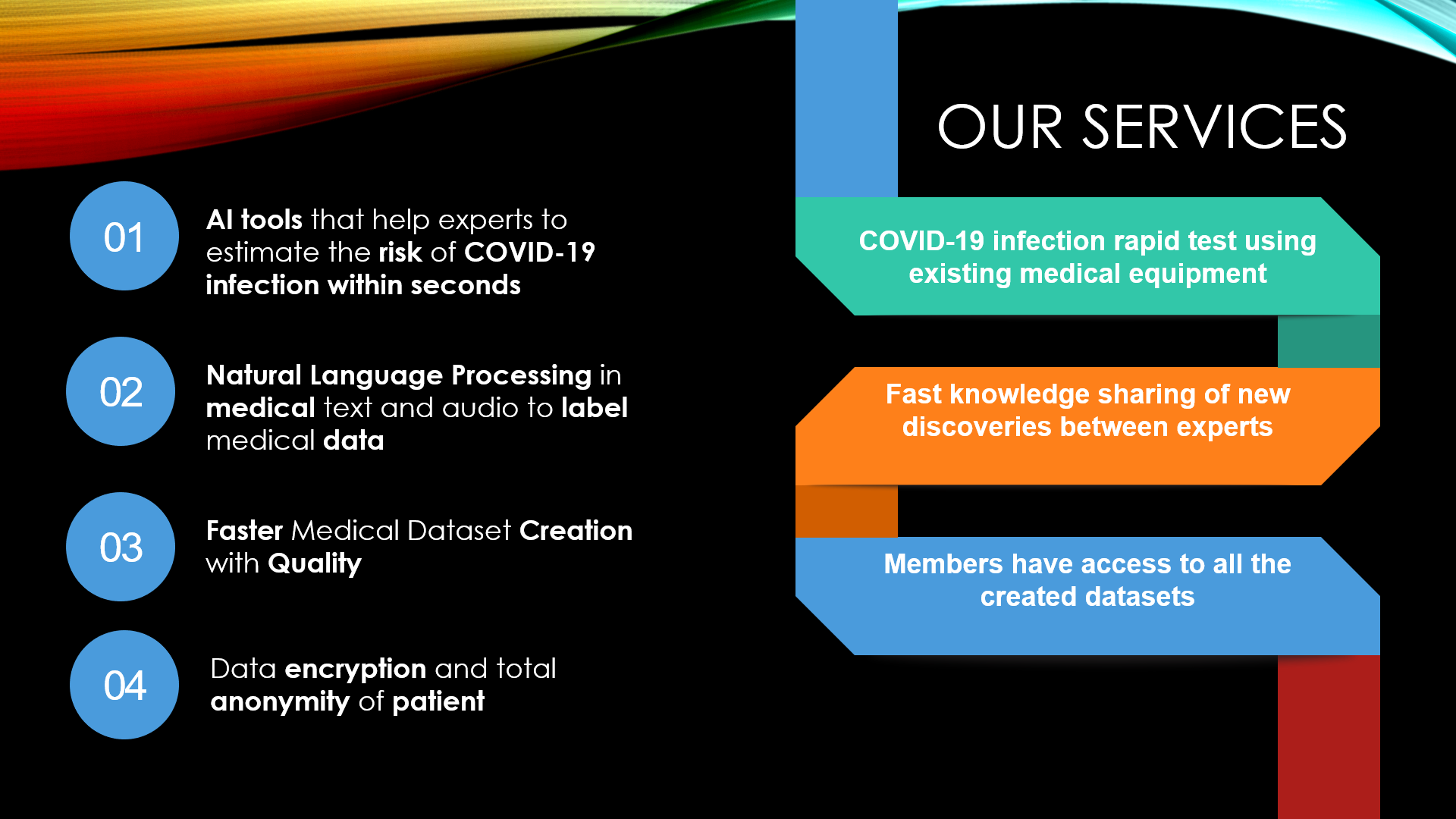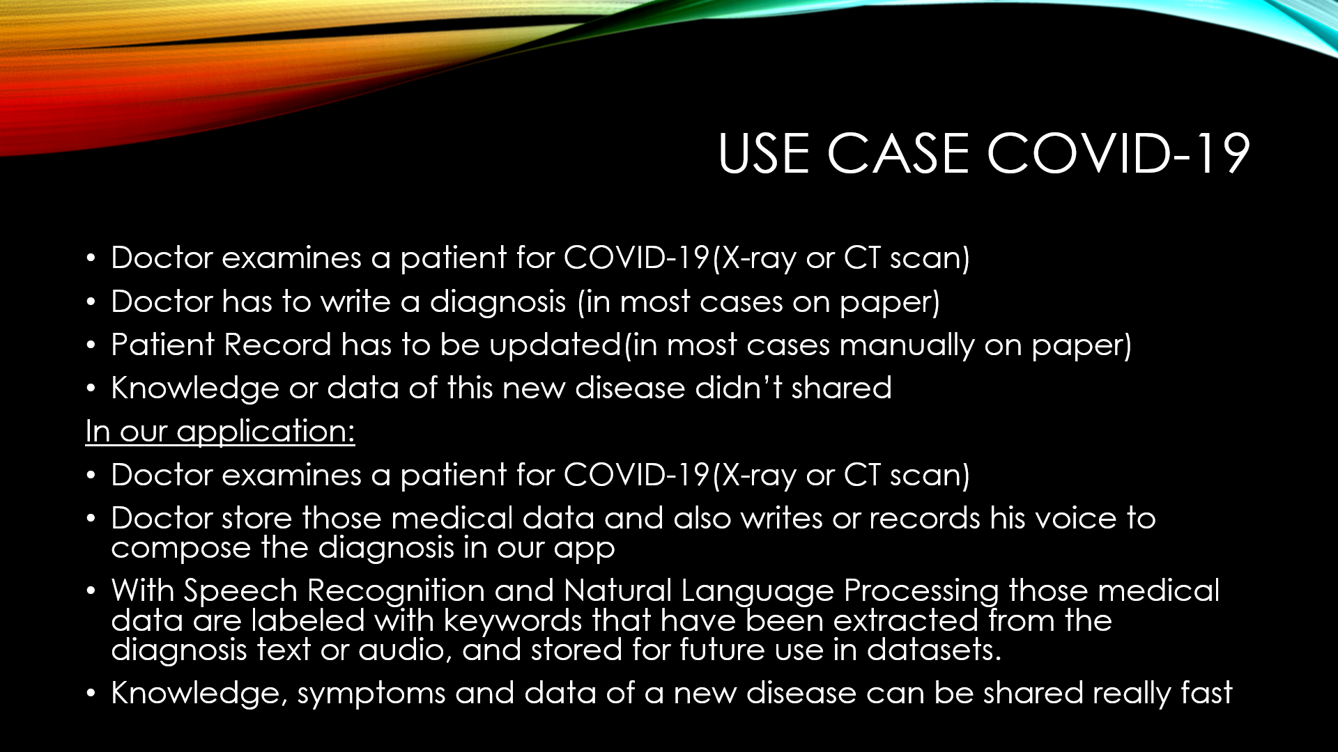 The doctor is also able to write his final diagnosis in our application via text or just record his voice. Then, in our application, we use a sophisticated tool of Natural Language Processing(NLP) that extracts labels(or keywords) from the diagnosis text, or the voice (speech recognition). Those keywords in the case of COVID-19 can describe the symptoms(fever, cough, shortness in breath, etc.) Finally, the extracted labels are linked with the other medical data of the patient and stored in our cloud databases anonymously.