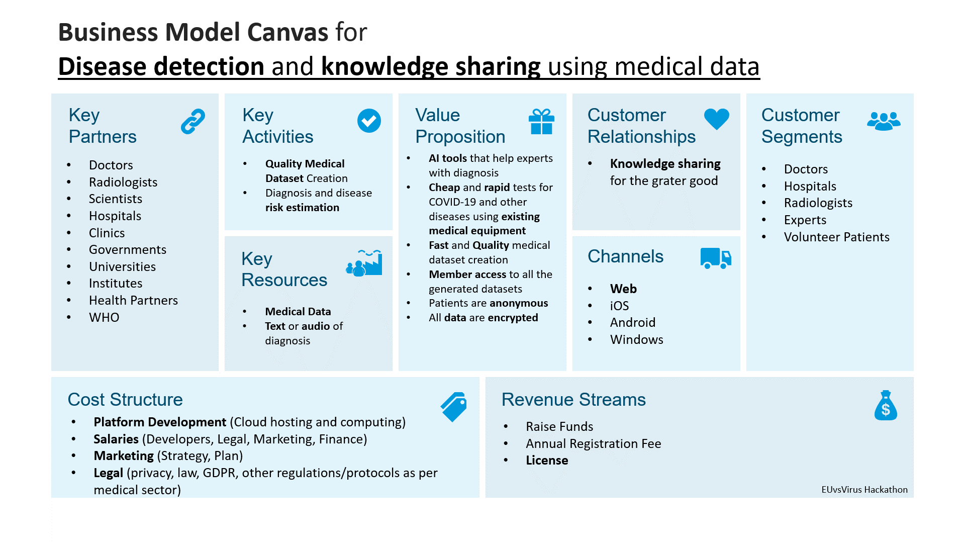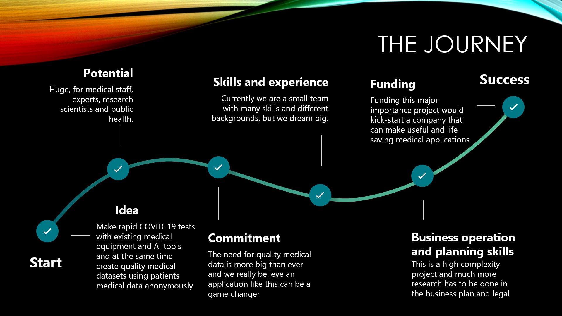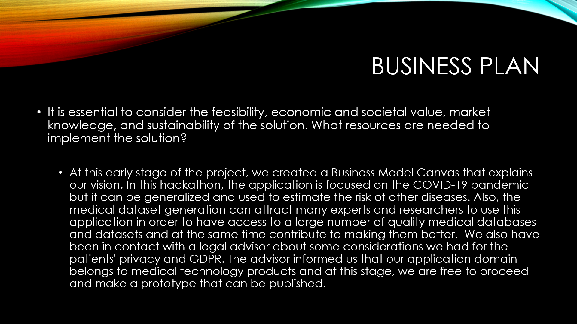 The workload for just 2 developers was massive and we were also forced to spend a lot of time in other more important for the hackathon tasks, like composing the business plan, the texts, the pitch video, and the presentation of this project. This is a high complexity project and we need more manpower to bring it to life. This application is using sensitive medical data and not all people willing to provide them for research purposes, even anonymously. What about GDPR? Legal help in those topics is needed. (Edit:We have been advised by a legal mentor that is perfectly legal to continue the development of this project at this point)