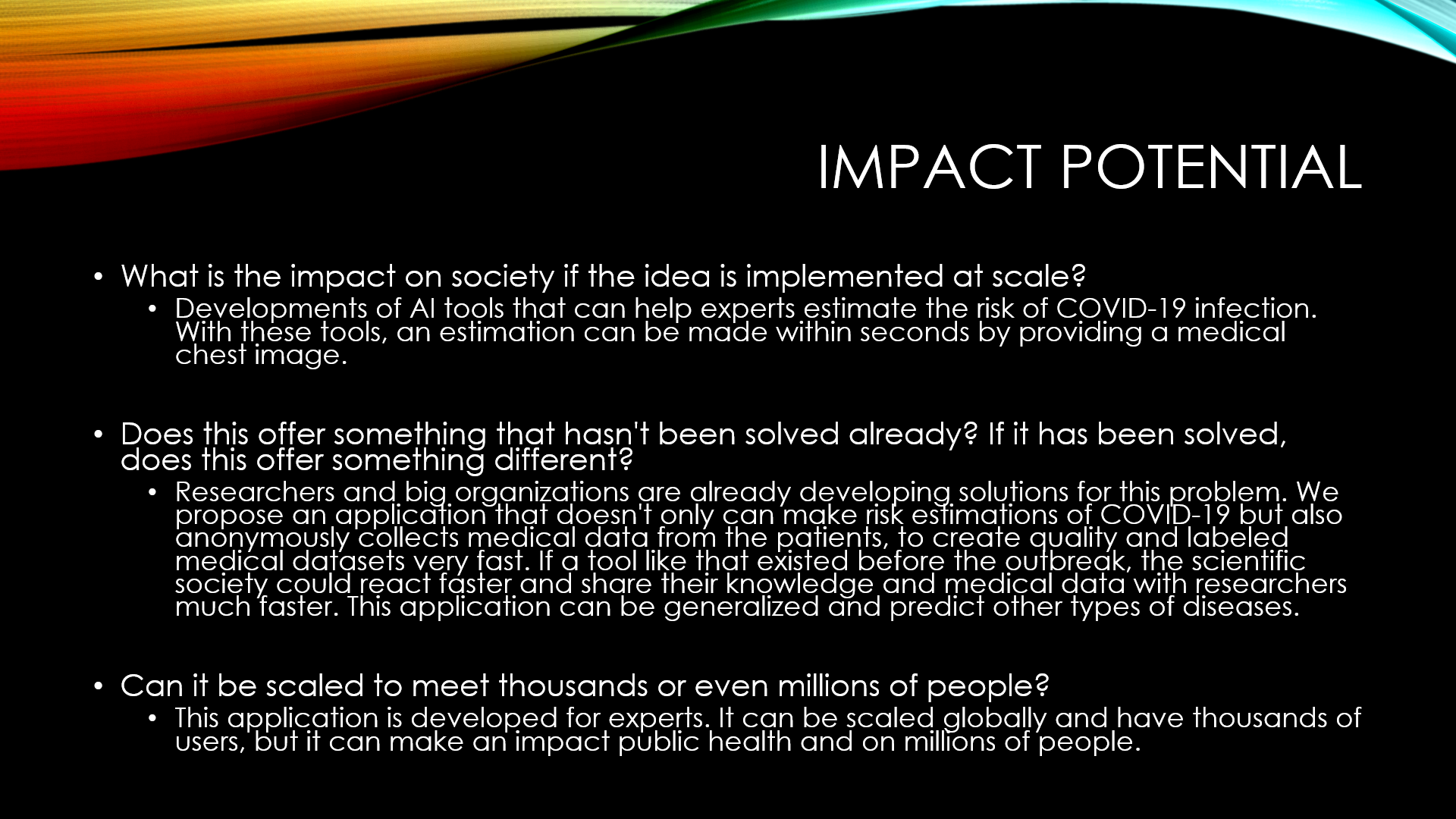 The next step is to develop everything we weren't able during the hackathon and even more. A nice feature would be the translation of the application to all the EU(at least) languages. This application can be used worldwide from doctors, radiologists, hospitals, and health institutes and I think we will be able to create medical datasets and share our knowledge in cases of emergency like CONVID-19 much faster. Although, there is a big discussion about medical data quality. For example, if the X-ray, CT, or MRI scans don't have good quality this can leed our model to false accusations and predictions. Also, the legal and the business side of this application needs much more development. The key to the feasibility of this project is to have major partners like governments or big health organizations and convince them about the importance of this application and the impact it can make to the lives of millions of people. The scale of this application depends on how many users are we going to have and how much cloud storage space we need to store our data. I believe an application like this has to be developed soon and with the right resources and will to work we can bring this project to life!