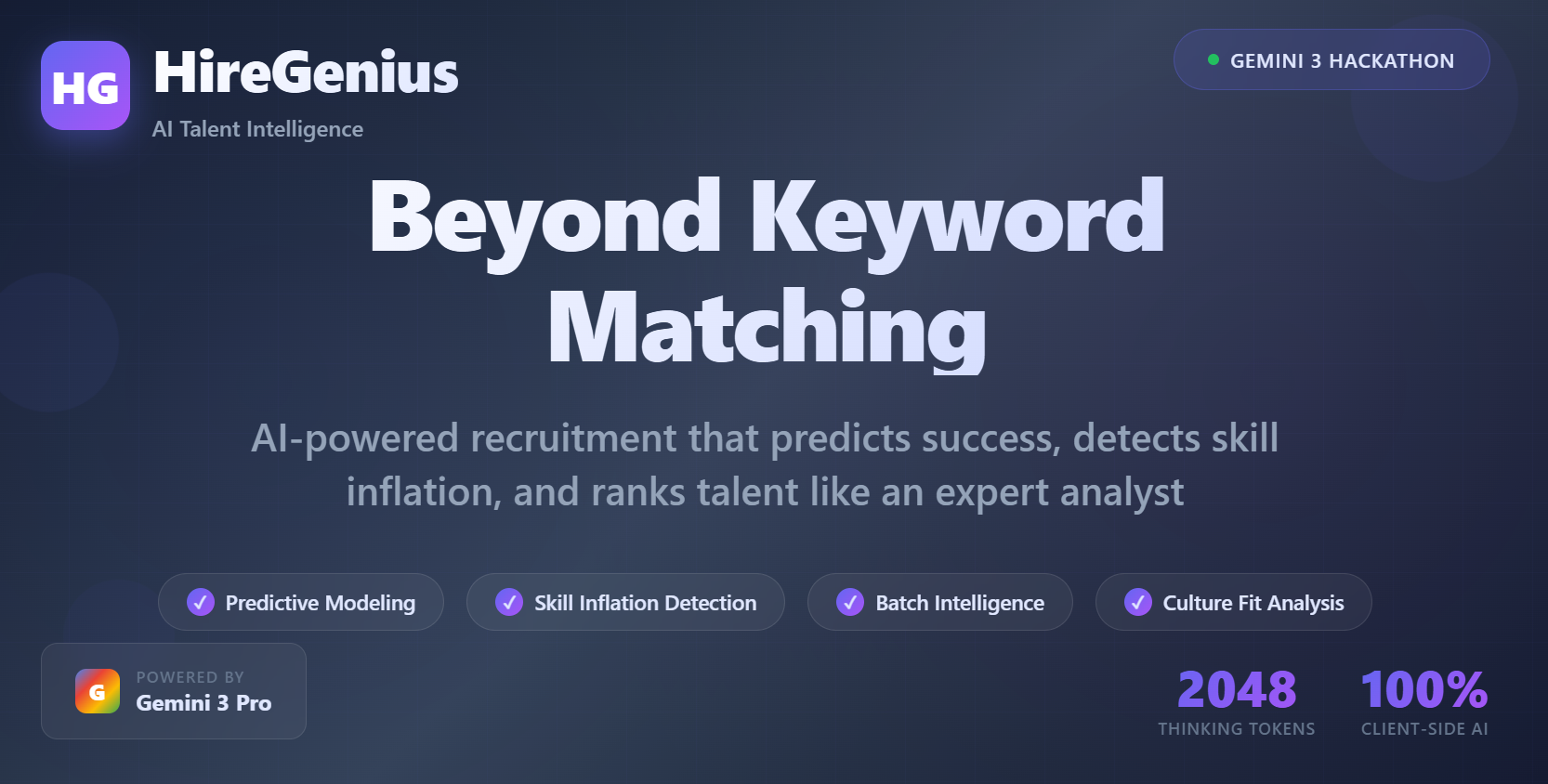 Vision: Eliminate the resume entirely. Paste a job description → AI automatically sources, screens, and ranks the top 10 candidates from a global talent pool with full explainability. Gemini 3's reasoning makes this possible for the first time.