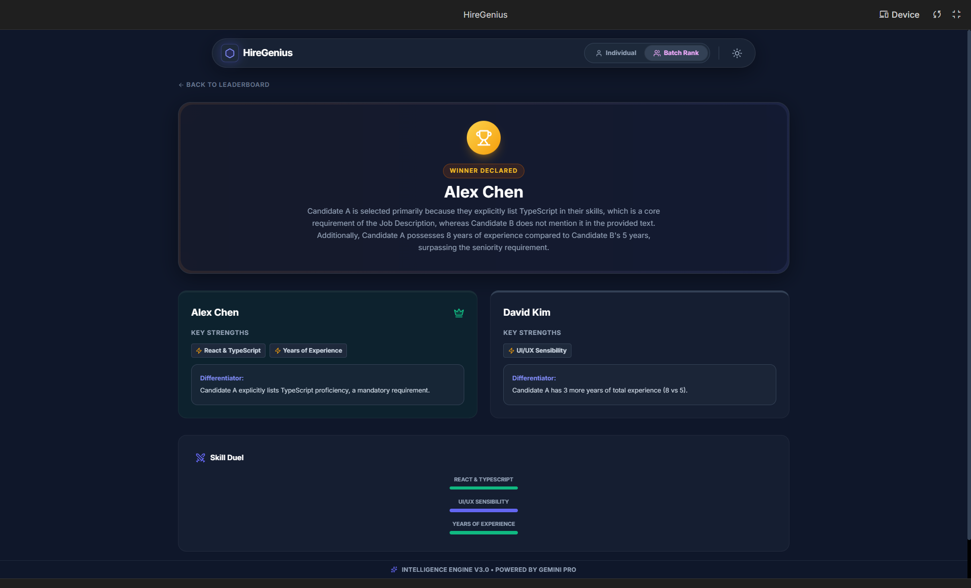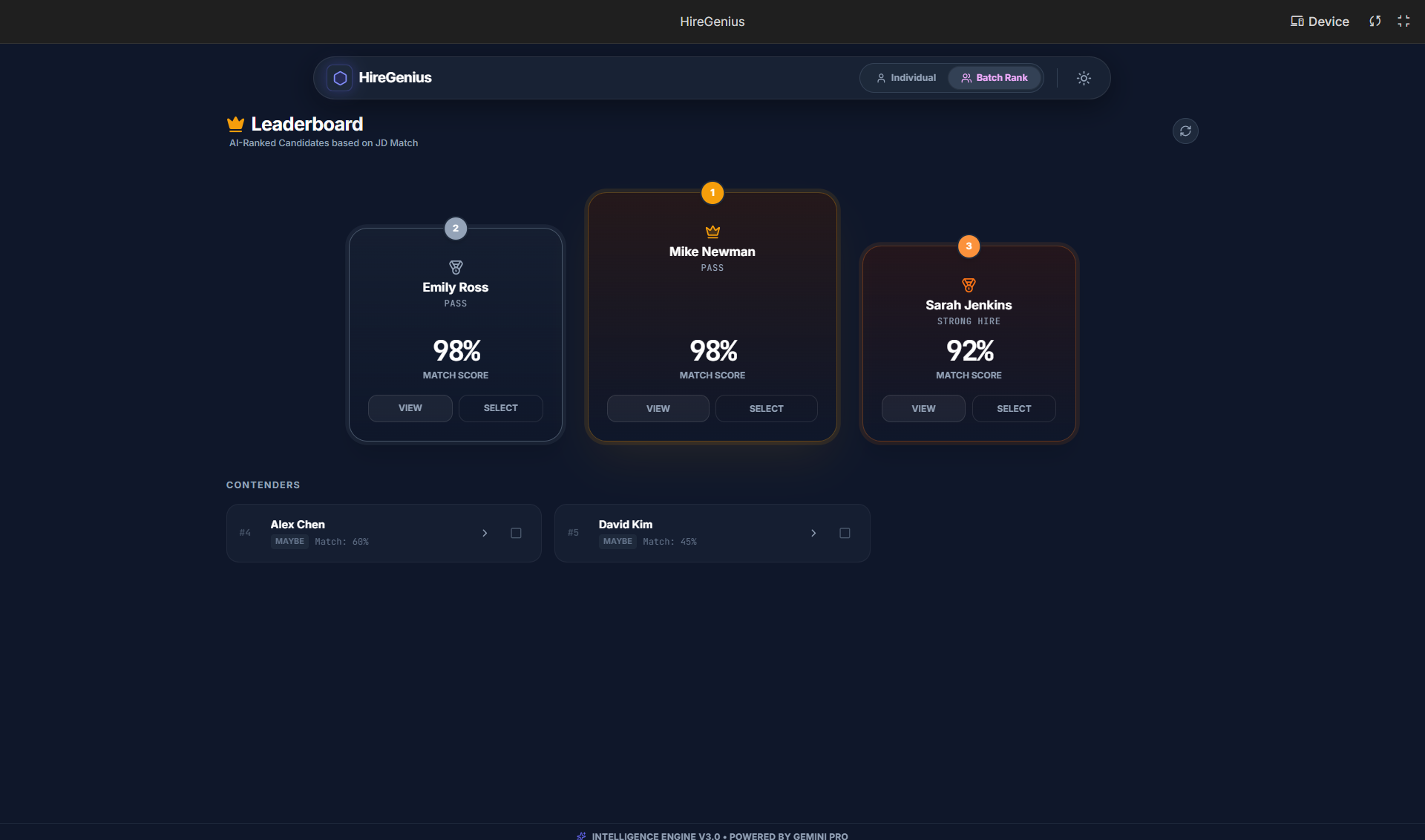 - Batch Intelligence: Upload 50 resumes, get an auto-ranked leaderboard