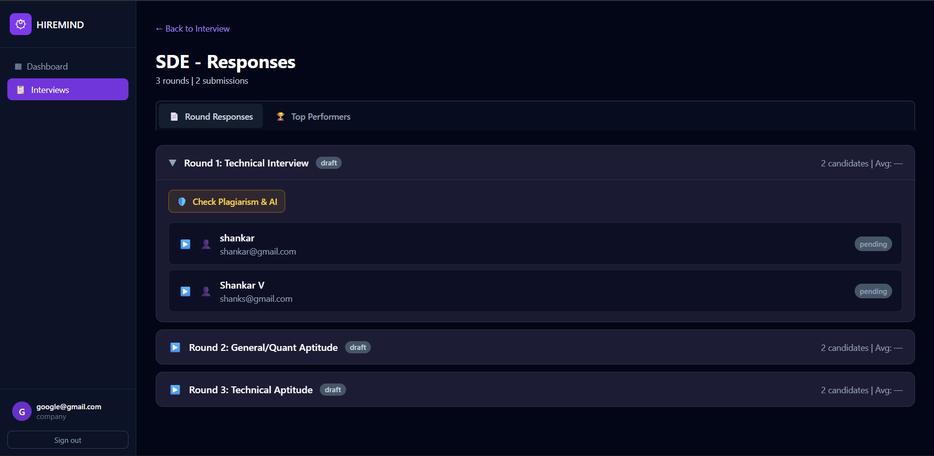 We built a working AI-powered interview platform that automates multiple stages of the hiring process. HireMind can conduct several interview rounds including aptitude tests, group discussions, coding assessments, AI HR interviews, AI technical interviews, and even support a final live human interview. We successfully integrated Gemini as the core LLM to dynamically generate interview questions, analyze candidate responses, and produce structured evaluation reports that help recruiters screen candidates more efficiently.