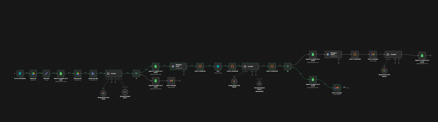 To solve this, I built an automated workflow where candidates submit their application through a form along with their resume. The system automatically extracts important information from the resume and uses an AI model to generate personalized screening questions based on the candidate’s profile.