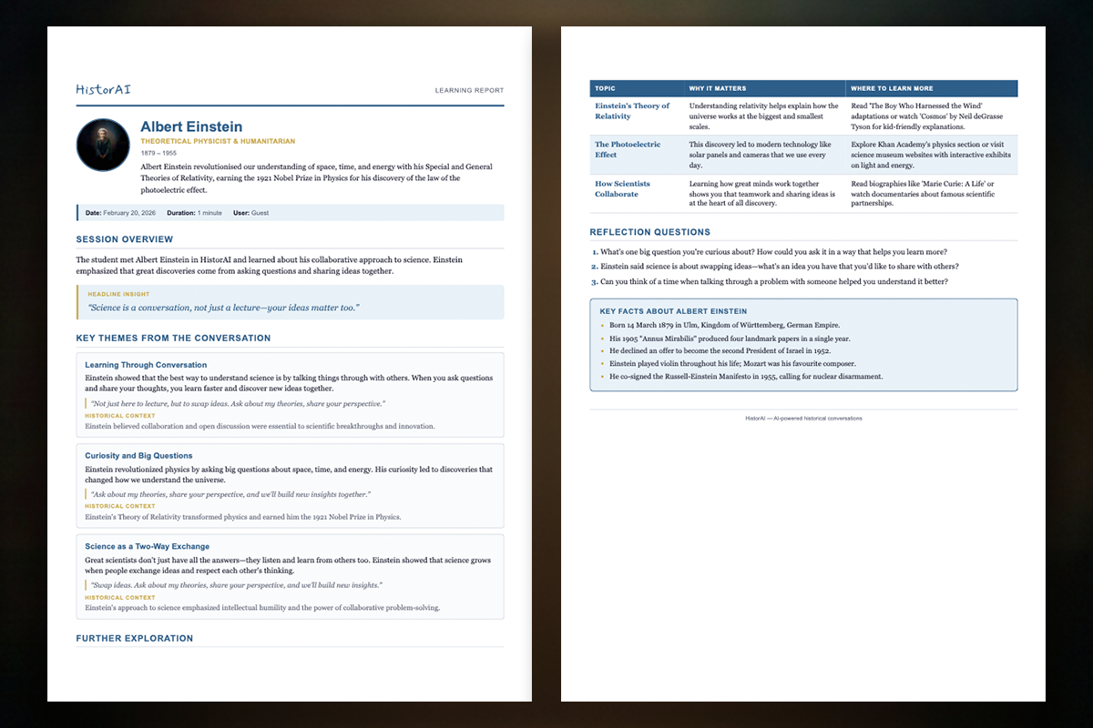 HistorAI was born from the idea that the best way to connect with history is in two phases: an engaging live conversation, followed by a polished document that captures what you discovered.