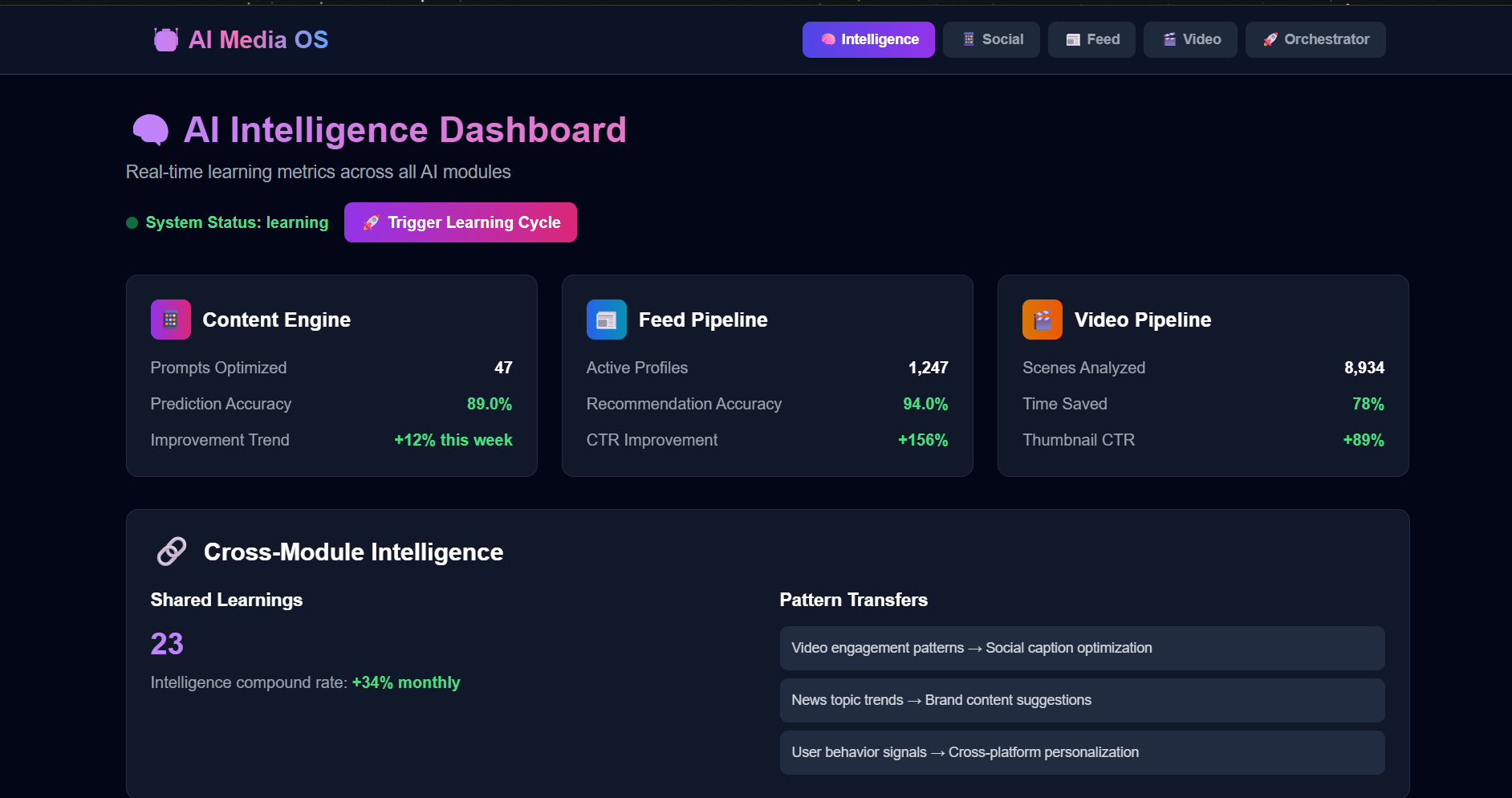 This architecture allows the system to behave like a media operating system, where each module shares intelligence through a common AI layer.