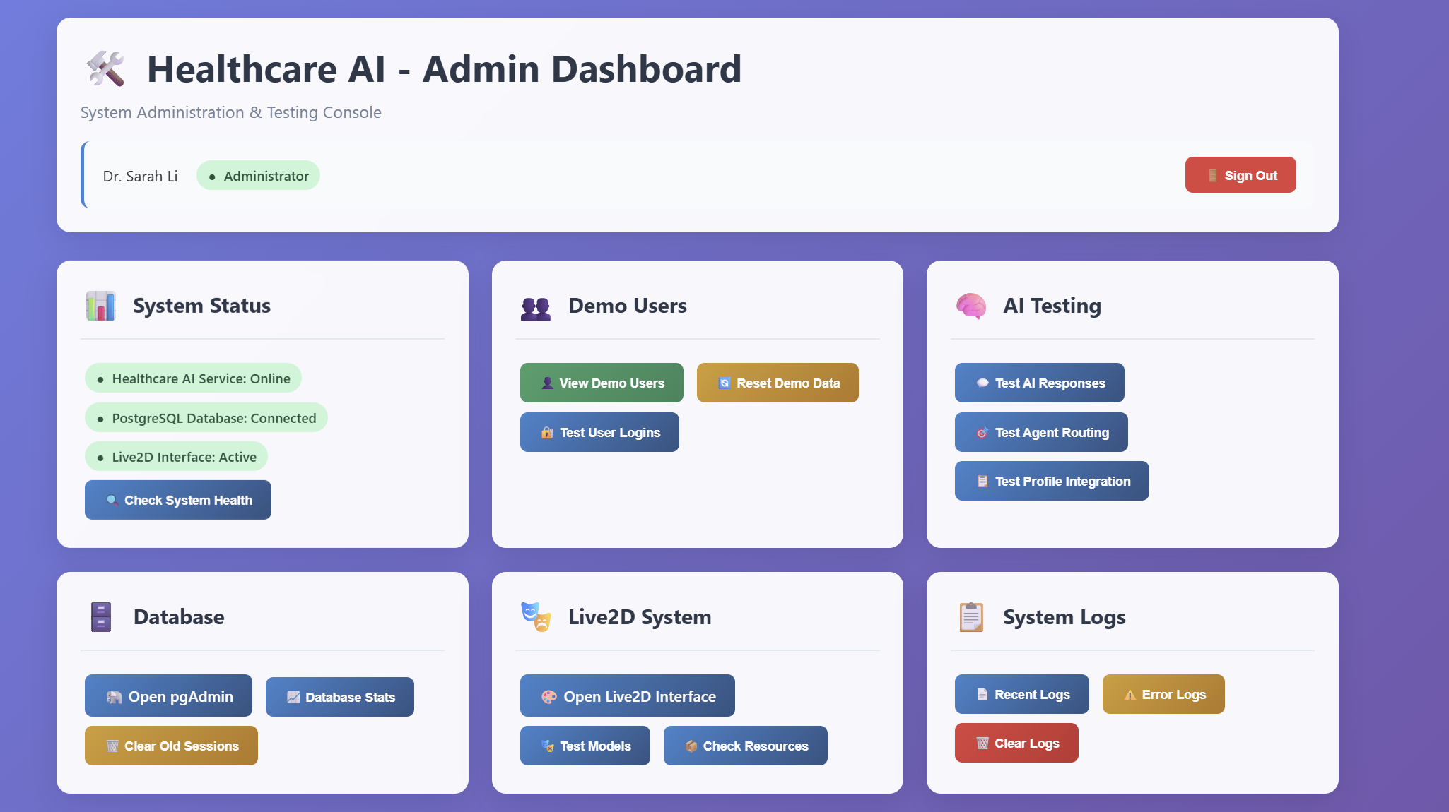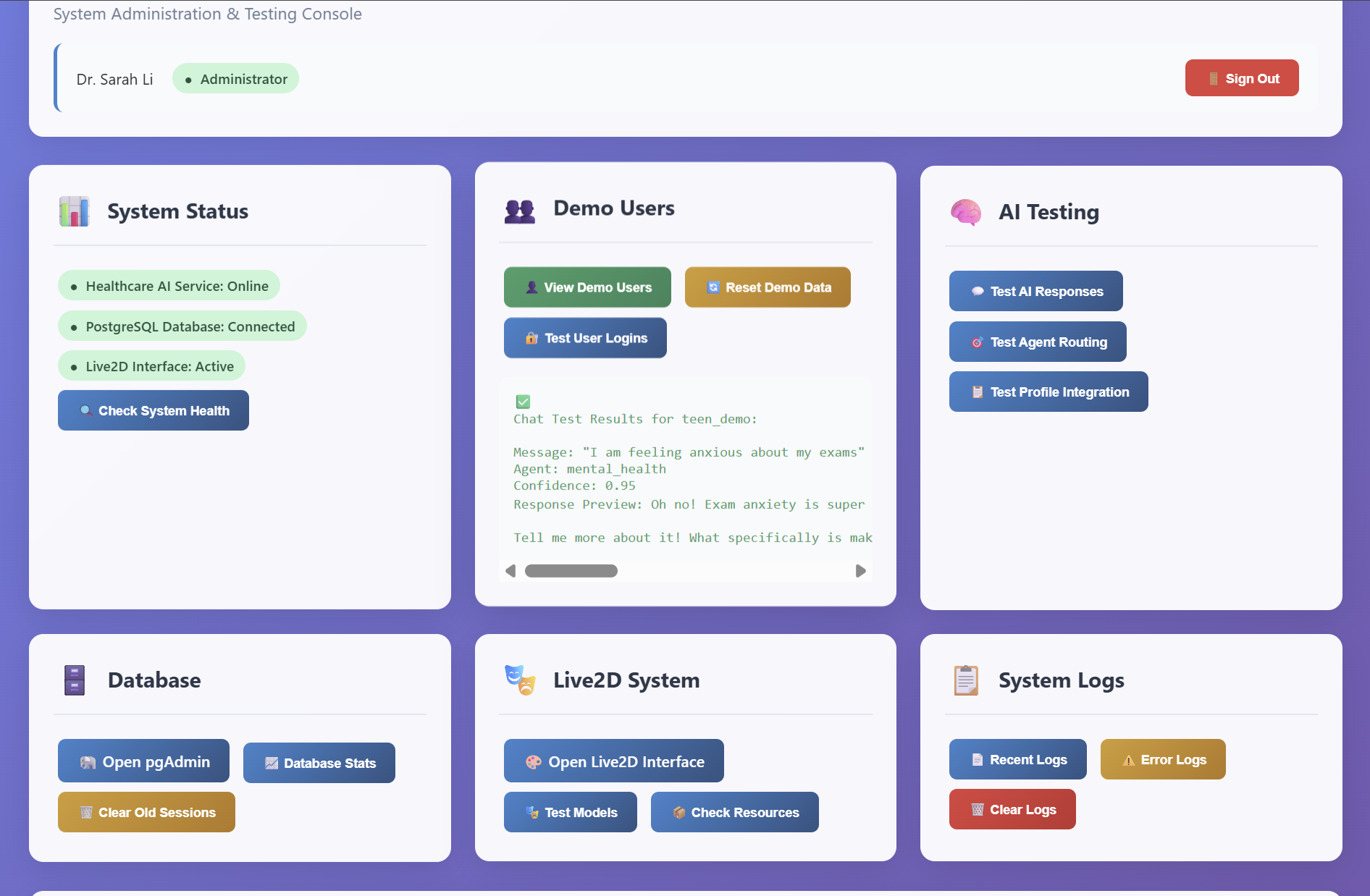 Healthcare AI System Administration & Testing Platform Overview The highly integrated Healthcare AI - Admin Dashboard empowers system administrators (such as Dr. Sarah Li) to oversee the full operation of the AI-powered healthcare support system. Through a suite of tools, administrators can analyse user data, monitor conversation records, and identify early signs of potential mental health risks.