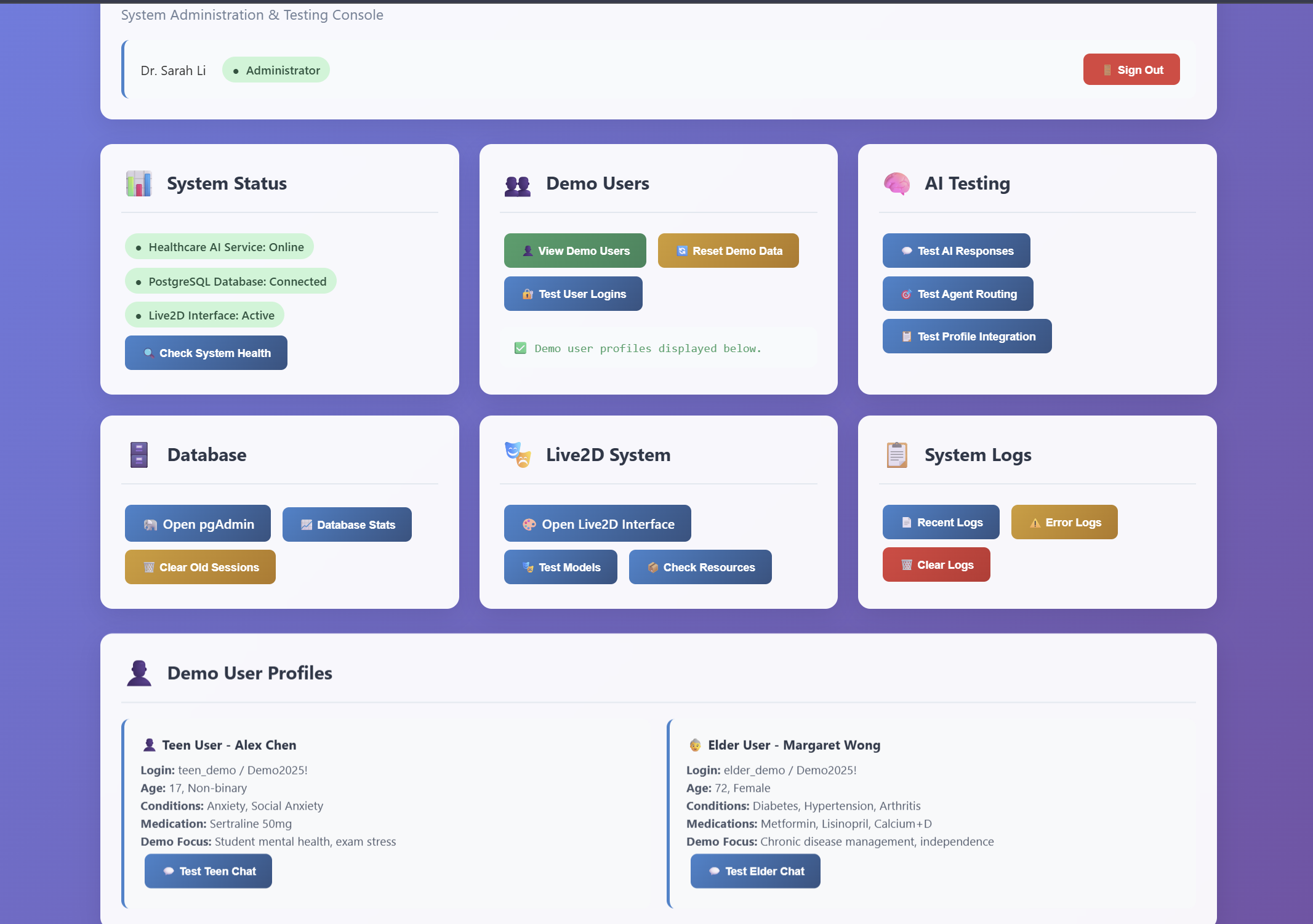 User Profiles & Conversation Monitoring Via the Demo User Profiles panel, administrators can access simulated user characteristics and interests—for example, teen user Alice Chen (interested in anime, gaming, and music; energetic, curious, and social) and elder user Margaret Wong (interested in gardening, cooking, and history; wise, patient, and nurturing). These profiles help simulate realistic interaction scenarios and allow the AI to tailor its responses based on personalized traits. Within the Demo Users panel, the system displays specific chat test results. These conversation logs not only reveal the AI’s response logic but also enable administrators to assess whether users are exhibiting signs of anxiety, depression, or other emotional distress.