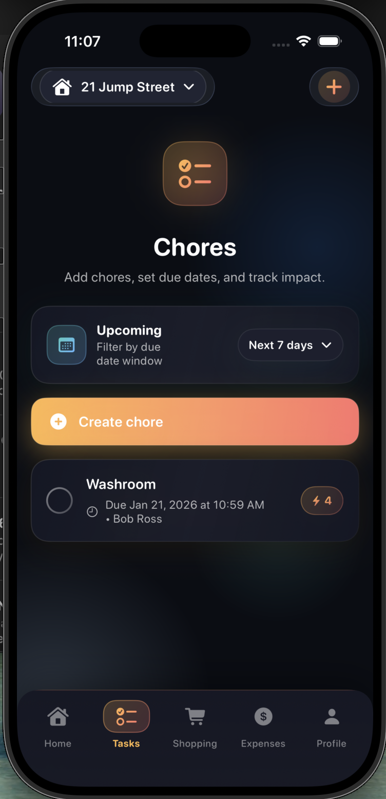 Juggling everything at once is hard. Classes, assignments, part-time jobs, clubs, and still remembering to take out the garbage or buy groceries. For people with ADHD, anxiety, or just overloaded schedules, small household tasks get lost, expenses pile up, and roommate coordination can become awkward or stressful. We wanted to build something that makes shared living simpler, friendlier, and more accessible, especially for students balancing heavy mental loads.