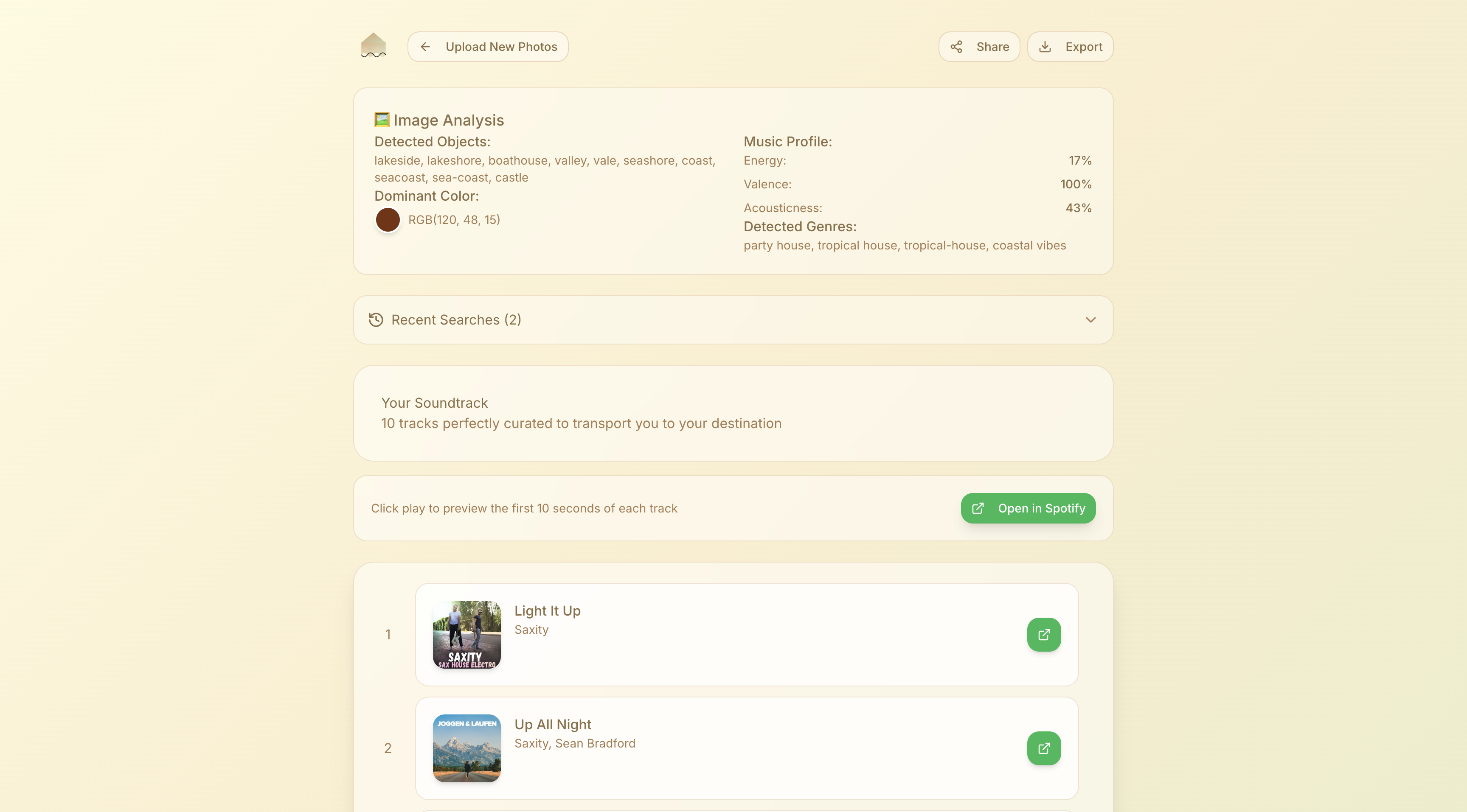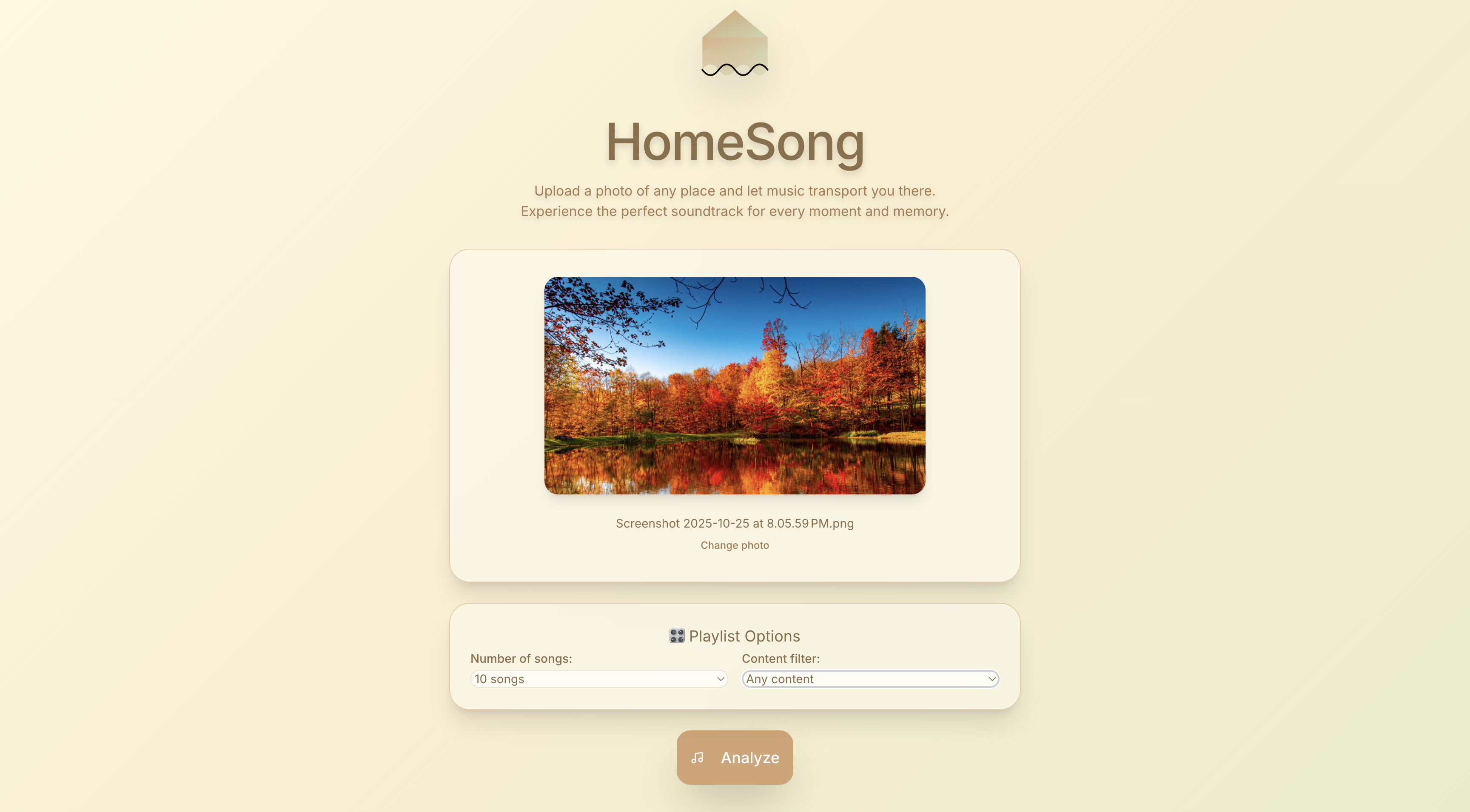 Being college students, we frequently find ourselves being homesick. One of the most effective ways to cope with this feeling is to scroll through your camera roll, each one transporting you back to that exact spot and giving you the same exact feelings. We wanted to enhance this experience by transferring it to music, essentially transporting you back to a place you cherish through sound. Our hack, HomeSong analyzes the nostalgic photos from your camera and generates personalized spotify song recommendations to transfer to your playlists. HomeSong selects based on a specific criteria based on the mood, colors, and environment depicted in the photos. Our process essentially works like this, the user uploads a photo, AI analyzes the key features, and finally you receive song recommendations out of 100k+ streamable songs, making any place feel like back home.