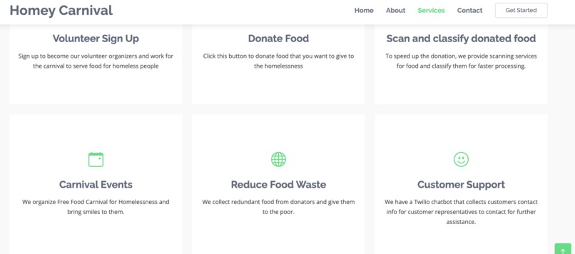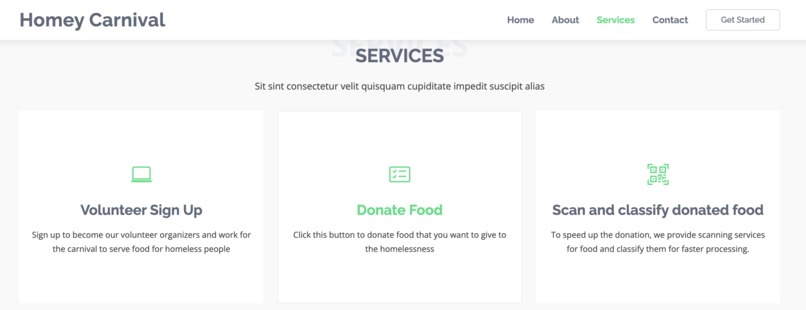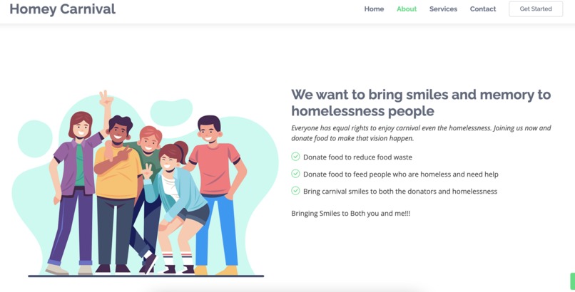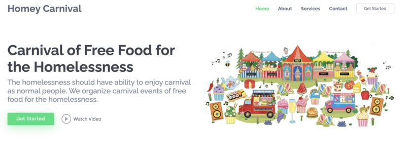 Thus, we built a site called "Homey Carnival". Our site helps to recruit volunteers and get donate or redundant food. Further, we want to organize carnival events with free food for homeless people.