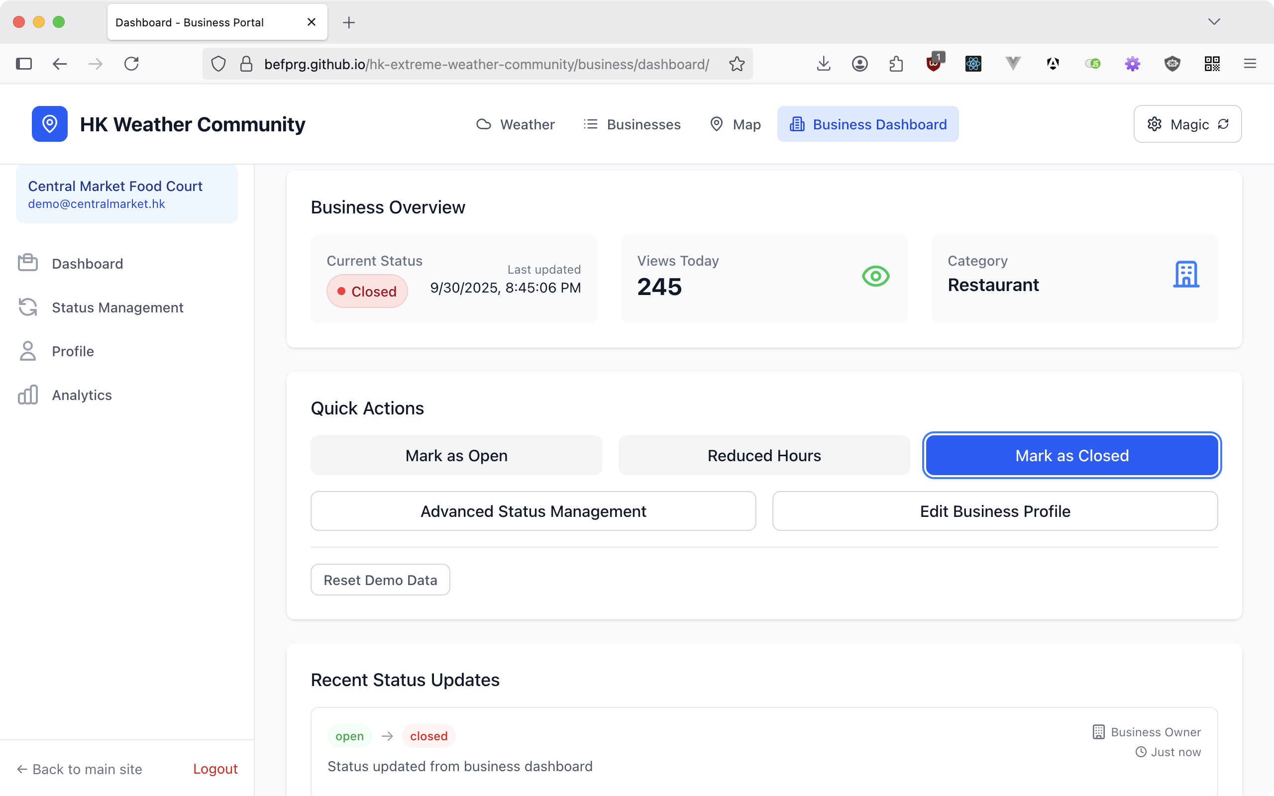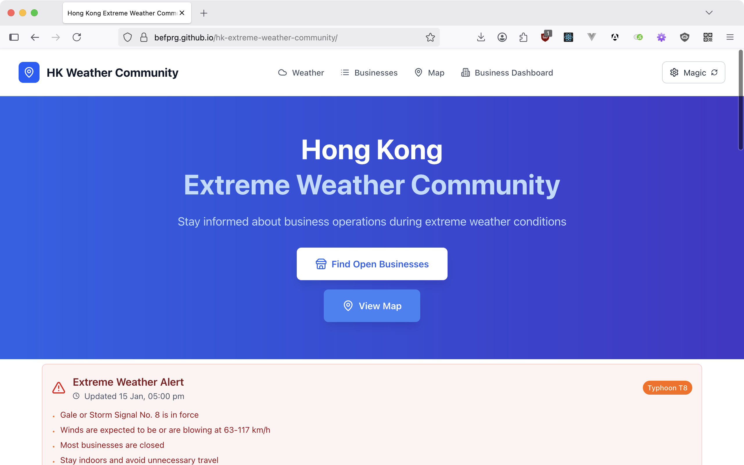 Our mobile-first web application provides real-time business status updates during extreme weather conditions. The platform features an interactive map, intelligent search filters, and automated status adjustments based on weather severity (T1-T10 typhoon signals, rainstorm warnings). Business owners can update their status through a dedicated dashboard, while community members can report incorrect information, ensuring accuracy when it matters most.