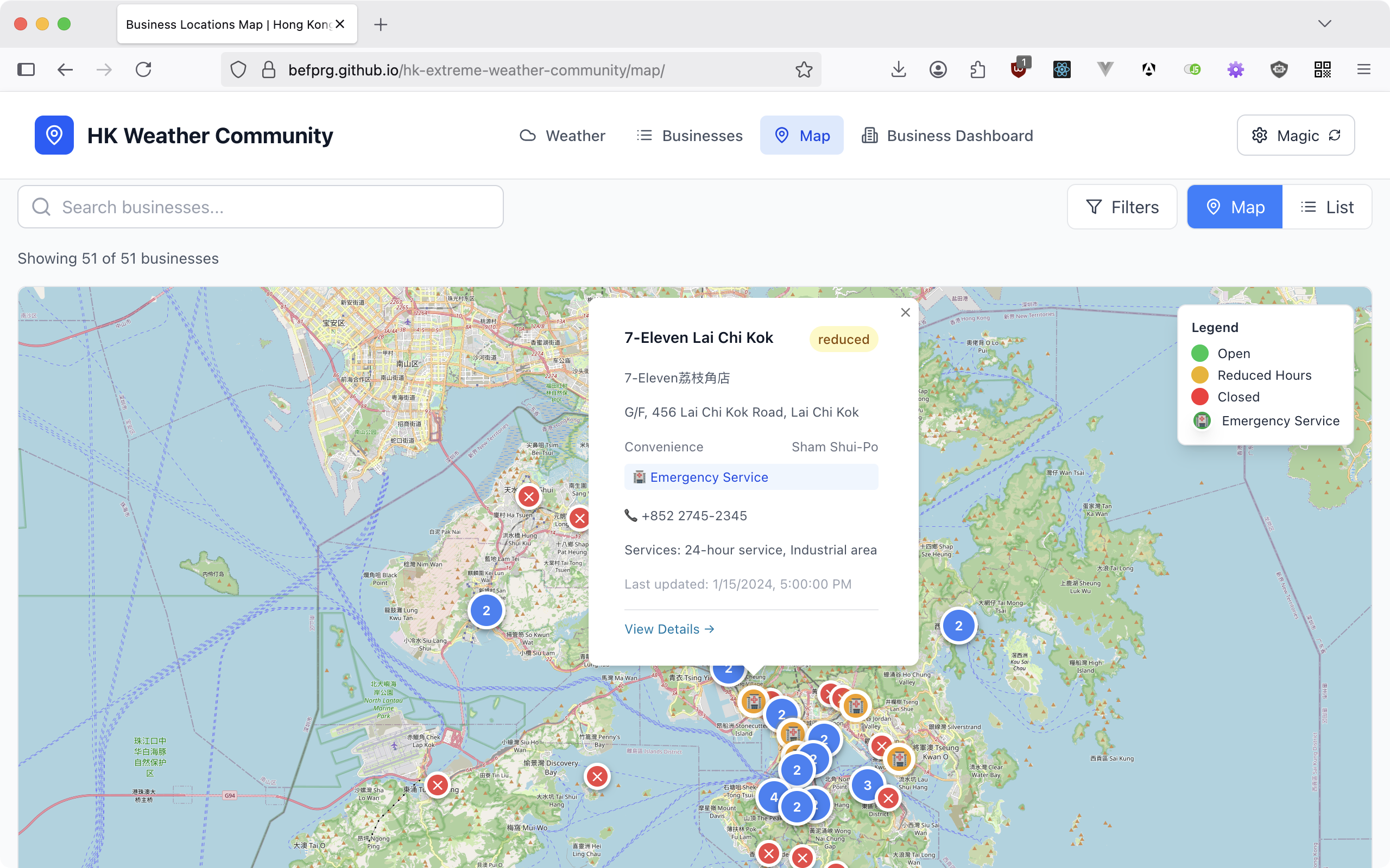 During Hong Kong's frequent typhoons and extreme weather events, people struggle to find which businesses remain open for essential services. When Typhoon Signal No. 8 is raised or Black Rainstorm warnings are issued, people need immediate access to information about open supermarkets, pharmacies, and convenience stores - but this information is scattered and often outdated.