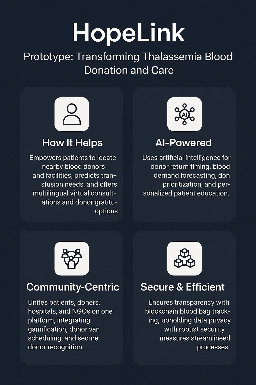 We envisioned HopeLink to connect the entire ecosystem β patients, donors, hospitals, and NGOs β into one real-time, AI-enhanced platform to solve this deep-rooted humanitarian issue.