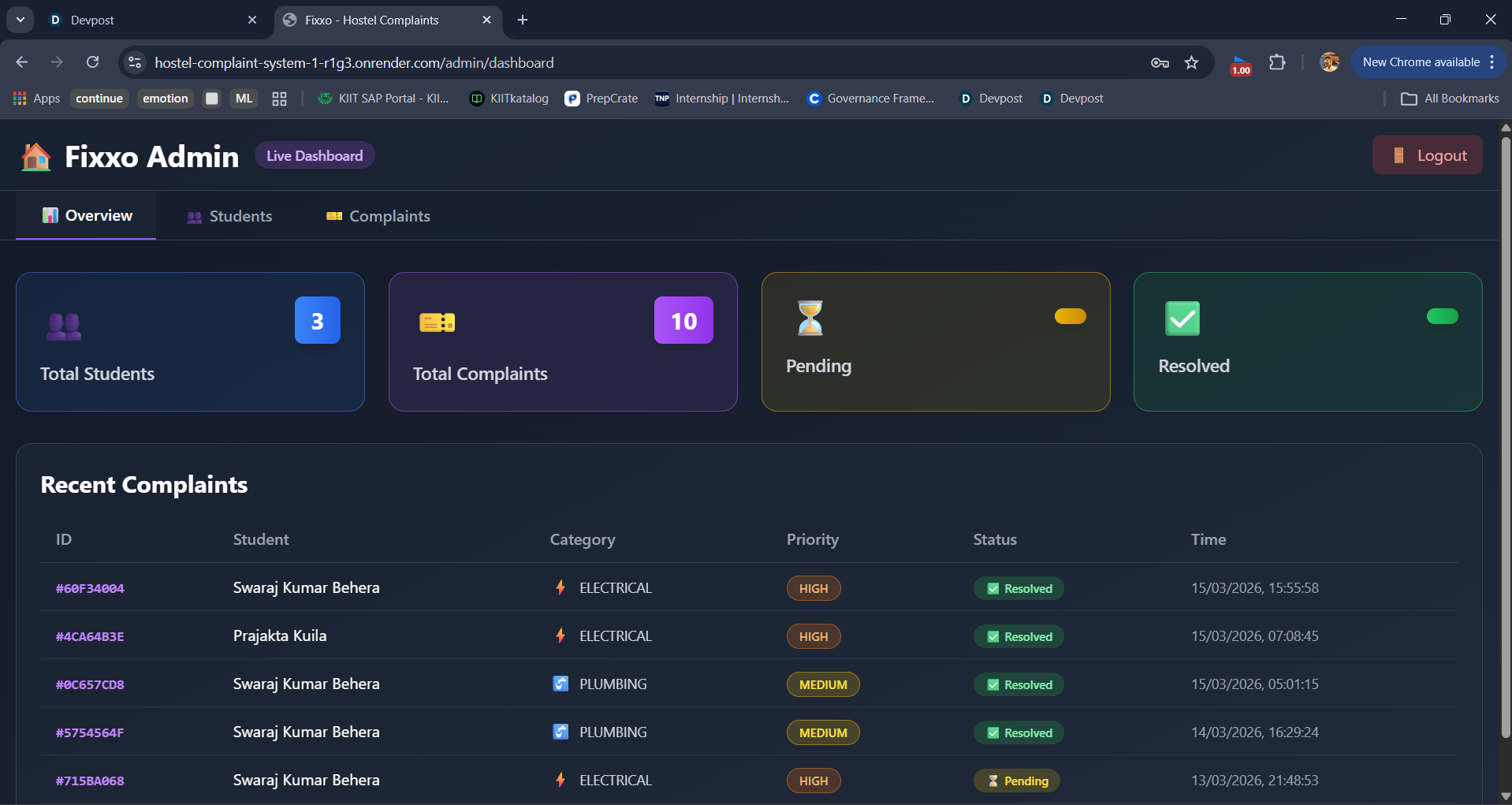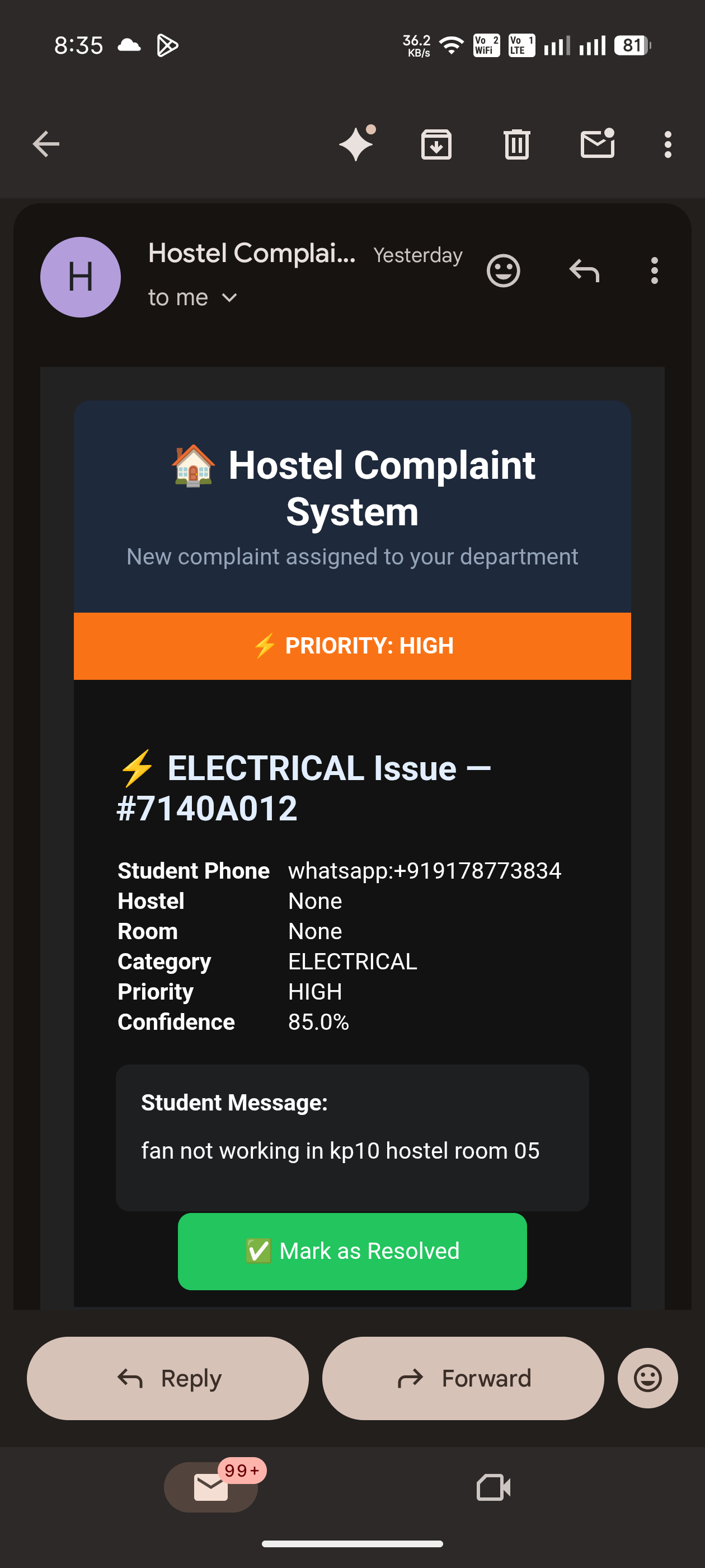 As a hostel representative, I regularly receive complaints from students about infrastructure issues such as plumbing leaks, electrical failures, WiFi problems, and maintenance requests. The current complaint system relies on a physical register where students must go to the hostel office and manually write their complaints. However, many students avoid doing this due to inconvenience, time constraints, or hesitation in approaching wardens directly. Additionally, wardens have a hectic schedule and must manually review the complaint register and forward issues via email to the appropriate department. This manual process often causes delays in resolving problems, even for urgent issues. As a result, students experience frustration and inefficient complaint resolution. This inspired me to build an automated, AI-powered complaint management system that simplifies the entire process and eliminates manual intervention.