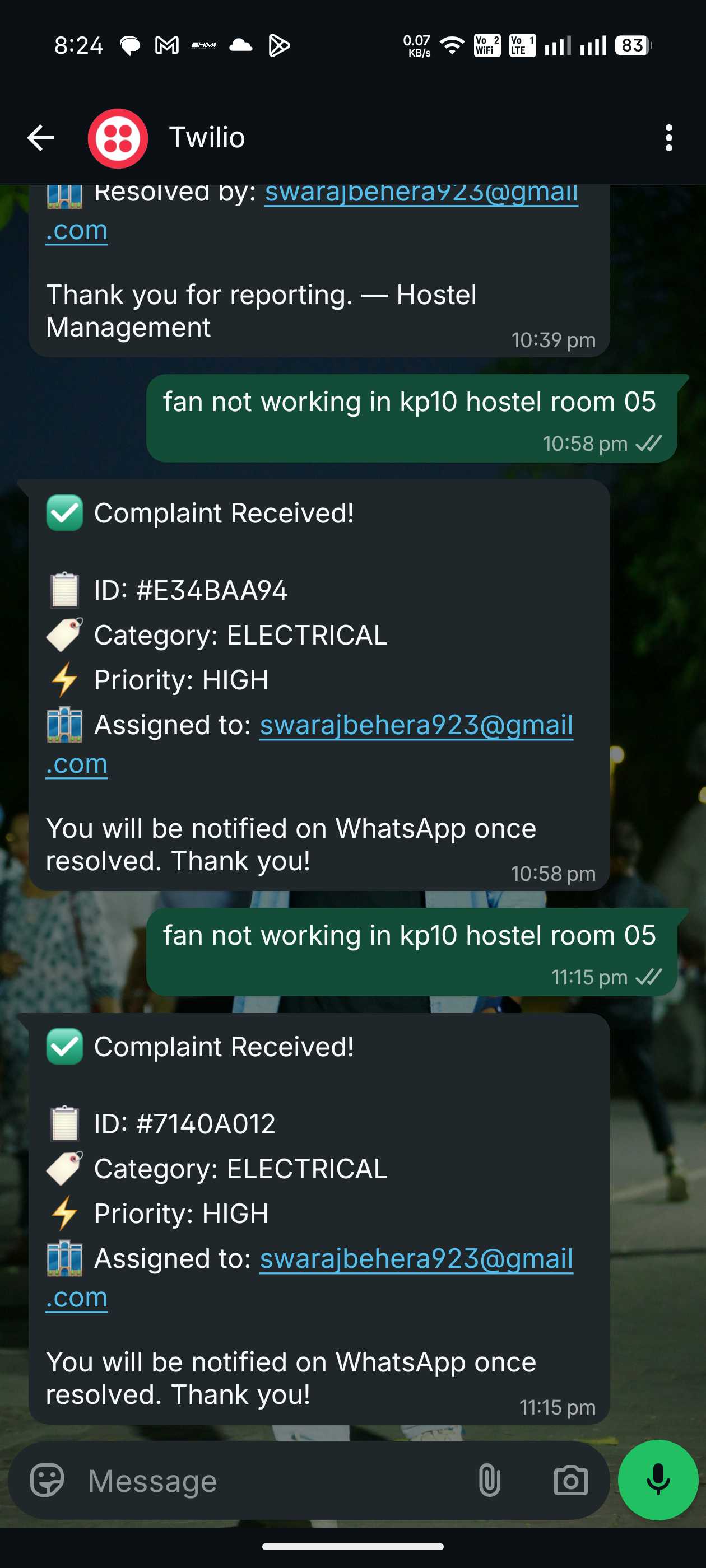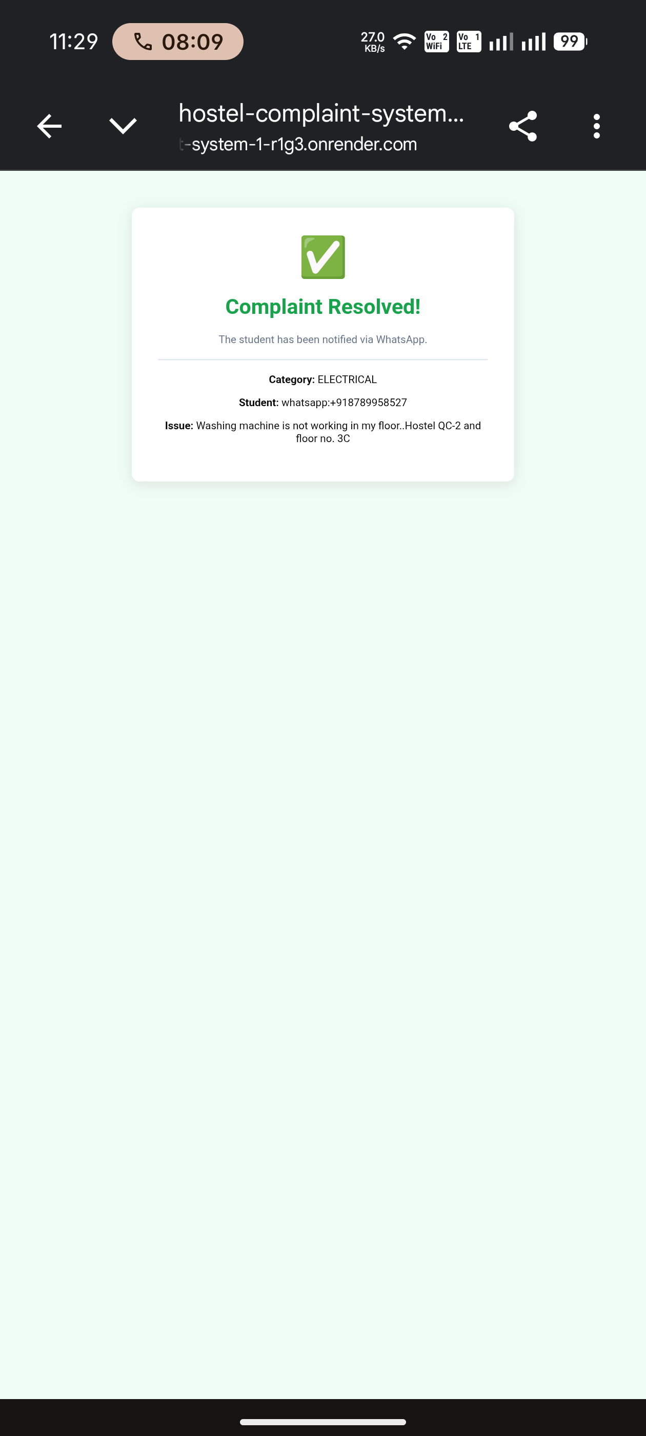 We are proud to have built a fully functional end-to-end AI-powered complaint management system that automates the entire complaint lifecycle without manual intervention. One of our key accomplishments was successfully integrating the WhatsApp Business API with a backend server to receive real-time complaints from students. This eliminates the need for physical complaint registers and makes reporting issues simple and accessible. We also implemented an AI-powered classification engine that automatically extracts structured information such as hostel name, room number, complaint category, and priority from unstructured WhatsApp messages. This enables intelligent routing of complaints to the correct department without human involvement. Another major accomplishment was designing a scalable backend architecture using FastAPI and PostgreSQL to store, track, and manage complaints efficiently. The system also sends automated email notifications to departments and resolution updates back to students via WhatsApp, creating a complete automated feedback loop. We are also proud of building this system based on a real-world problem observed in our hostel, making the solution practical, impactful, and deployable in real environments such as universities, apartments, and organizations. This project demonstrates how AI can be used to automate operational workflows, improve response times, and enhance overall infrastructure management efficiency.