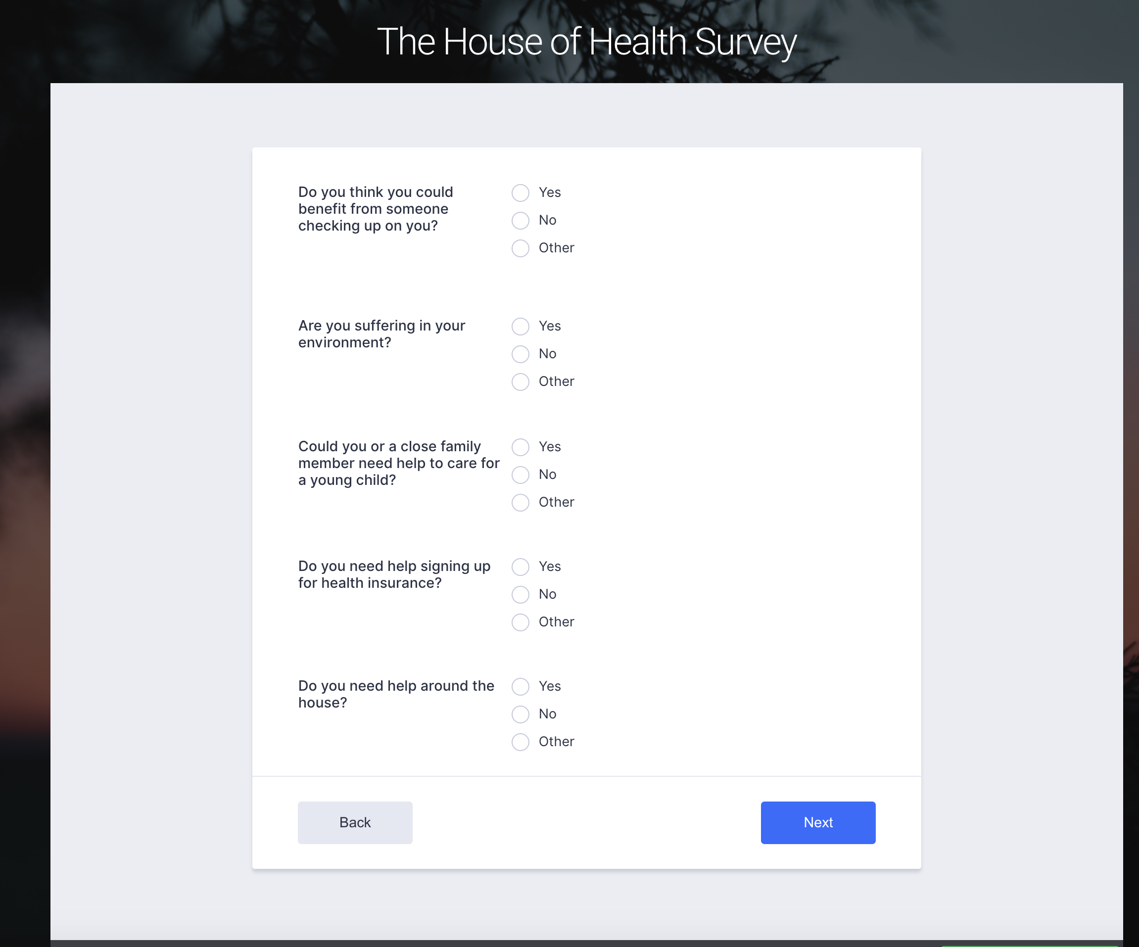 The House of Health is an innovative solution designed to help elderly people to reach out to the resources and help they need when facing mental health issues. The friendly-for-beginners system allows the public to navigate our page in a very simple way which is ideal for people who have little understanding of how to search on the web. Our developers have composed a survey in which elderly people can answer several questions for screening and then our system will look for all resources in the area based on eligibility and specific mental health issues. The list of resources are based on the responses and is a gateway or connection between the elderly and non-profit organizations that are willing to help people combat with main causes such as isolation and loneliness.