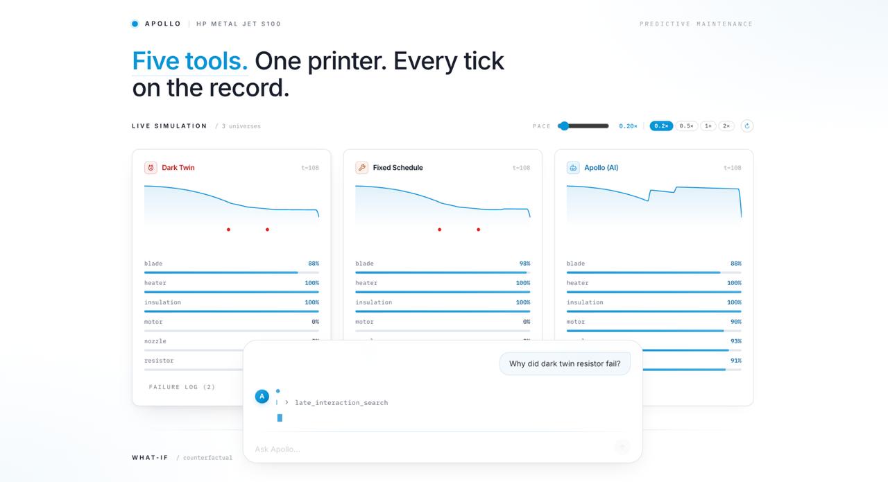 Apollo is our attempt to build the reasoning layer behind that machine: a physics-grounded digital twin that can run the printer forward, compare maintenance policies, branch counterfactual universes, and let an operator ask an AI agent why a component is failing with citations back to the simulated historian.