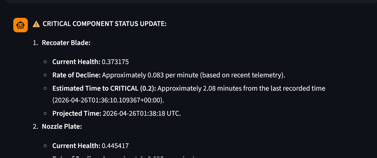 Phase 2 (Simulate): A real-time simulation engine cycles the printer through IDLE → HEATING → PRINTING → COOLDOWN states, injecting Gaussian noise for sensor realism and persisting every tick to a SQLite historian. A proactive maintenance agent monitors health velocities and intervenes before failures occur.