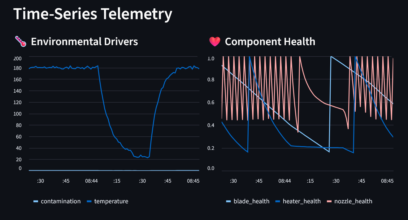 Temperature spikes breaking the Nozzle Plate: Instantaneous jumps from 25°C to 180°C during state transitions caused the Weibull hazard to spike unrealistically. We solved this with exponential temperature smoothing ($\text{temp} = 25 + (T_{\text{target}} - 25)(1 - e^{-3t/d})$) to model thermal inertia.