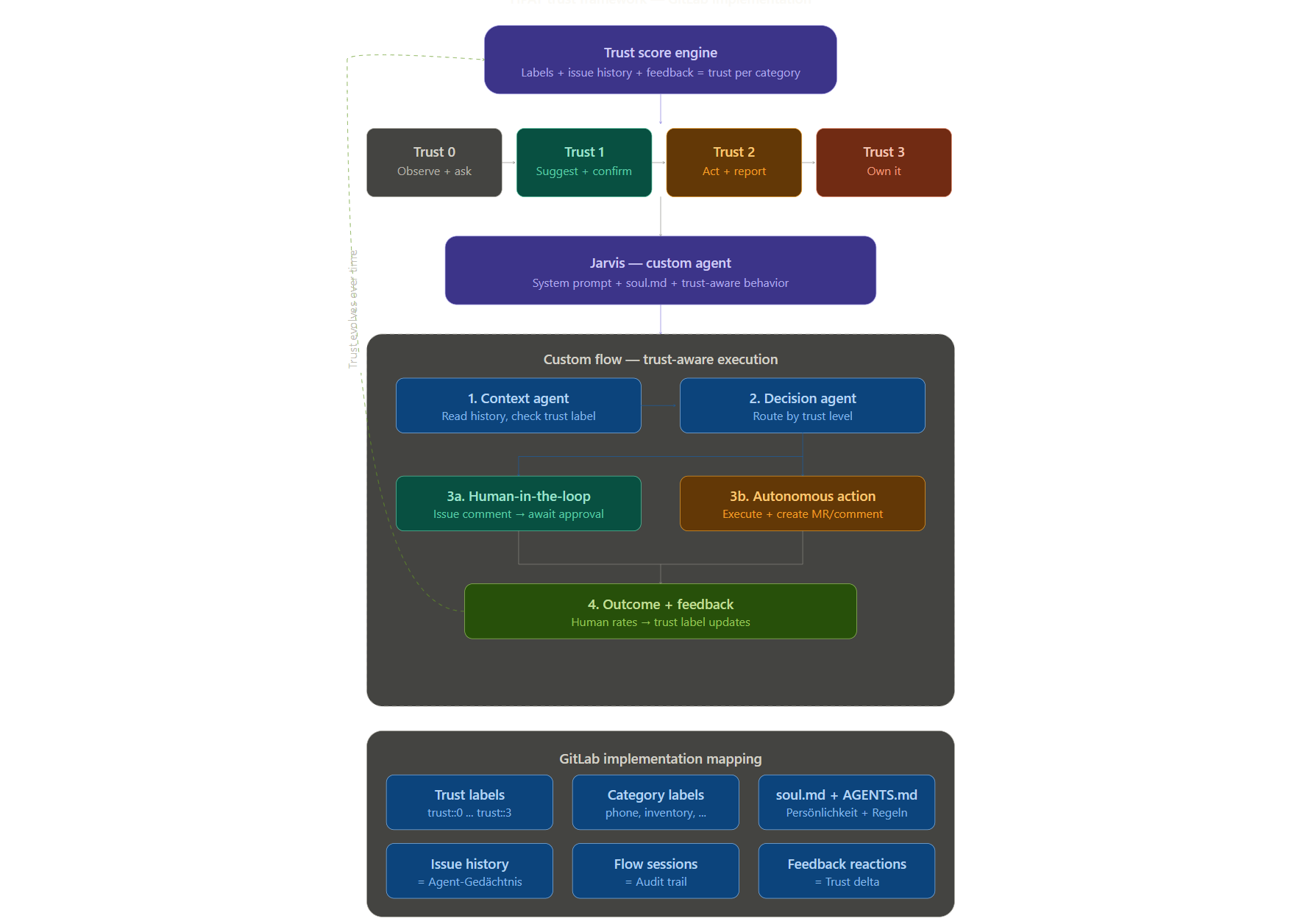 Mapping a human concept (trust) to a technical system. Trust isn't binary. It's contextual, emotional, and built over time. Encoding this in GitLab labels and issue history is a simplification — but a useful one.