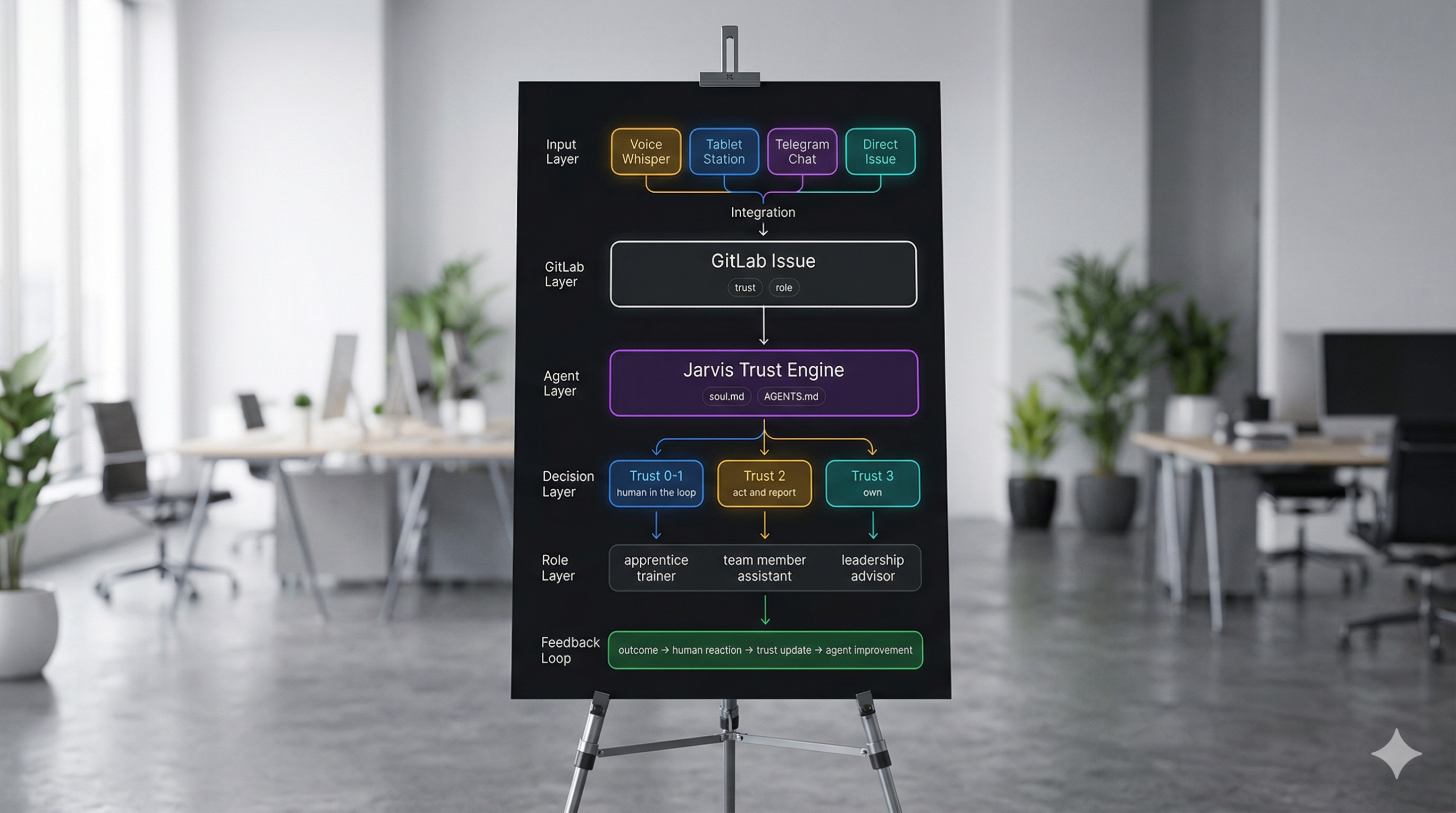- Real-world validation. This isn't a theoretical framework. It emerged from 6 months of daily collaboration between a dental team and AI agents. The trust levels, the feedback loops, the personality layer — all of this was tested with real people doing real work before it was implemented on GitLab.