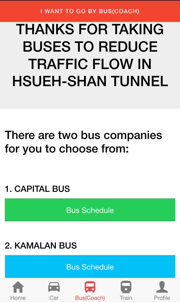 We are a software that are useful for both people transports between Taipei and Yilan and concerned authorities. For people transports between Taipei and Yilan, they can easily grab needed information and compare all ways in our app. For example, they can see which way is faster and cheaper now. Besides, we even provide discounts and booking system in our software. We can give some incentives to seduce them using public transport system. If they want to take the bus, they can book it immediately; if they decide to drive, they can reserve for reserved lane. They can use our services with app and website anytime anywhere. For concerned authorities, we are a real time supervisory control system. We can collect how many people book for reserved lane and they can make further modification. For instances, if they know around 2000 cars will influx into the system, they can distribute the lane or even suggest some users set off earlier with our serivce. They can also combine it with eTag and License Plate Recognition System to get some important parameters or charge higher with these users. We can control it better but not like now depend on police officiers' instinction. In conclusion, we are a two-way solutions for users and officiers. There will be a synergy effect if we can connect users and officiers with our services.
