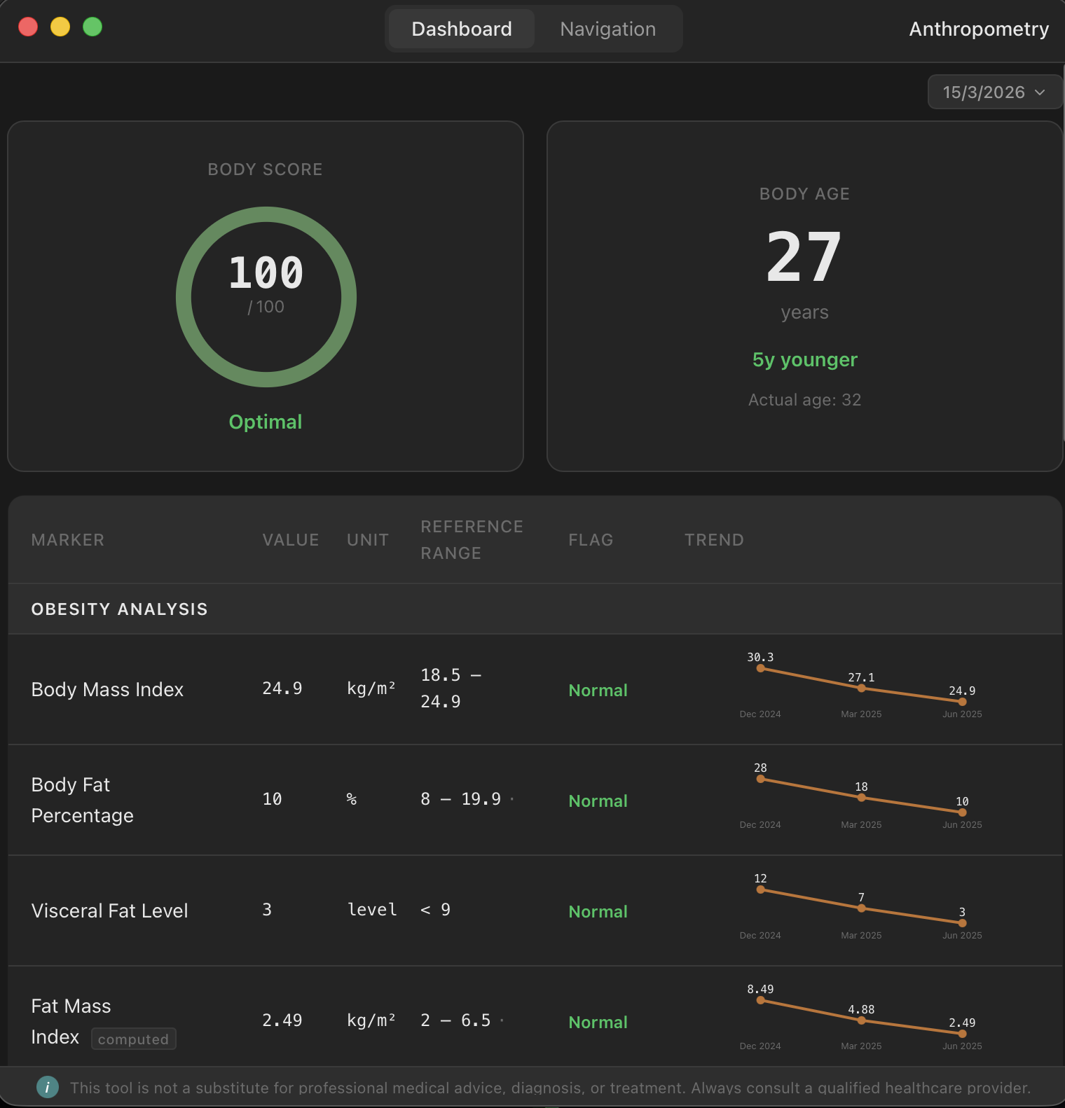 Neither camp solves the core problem: there is no tool that takes your raw diagnostics — blood work, imaging, body composition — normalises them into a common framework, runs validated analysis, and gives you a clear, auditable, reproducible interpretation. One where you can trace every finding back to the exact model and scoring system that produced it.