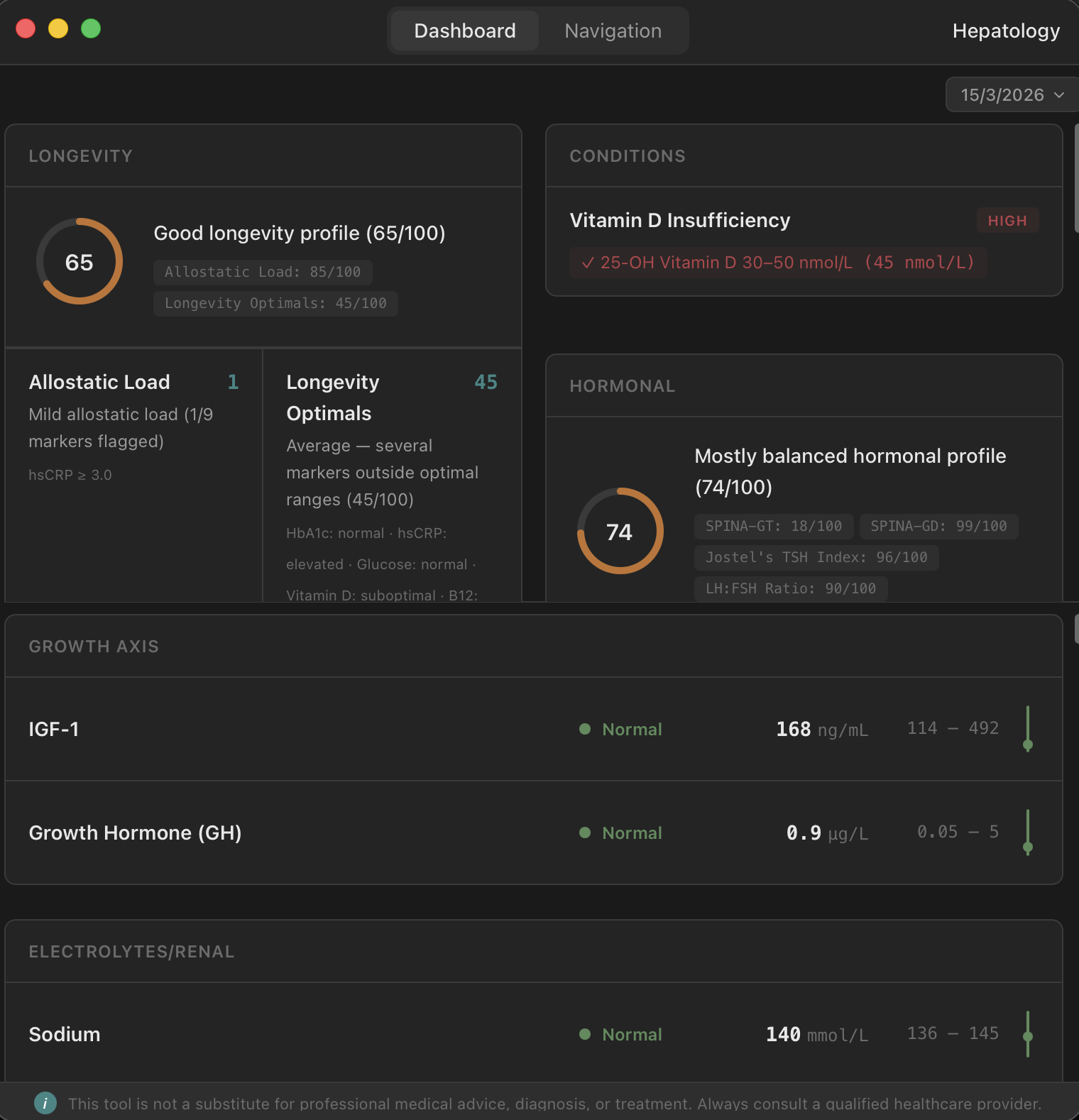 The hepatology node handles blood work. Upload a PDF from a major pathology lab — Laverty, QML, Sullivan Nicolaides, Quest, LabCorp — and hOS extracts every marker, normalises units and reference ranges, and runs multiple validated scoring systems. Longevity indices, metabolic panels, hormonal profiles, composite disease risk scores. All in under a second, with 99%+ extraction accuracy on supported labs.