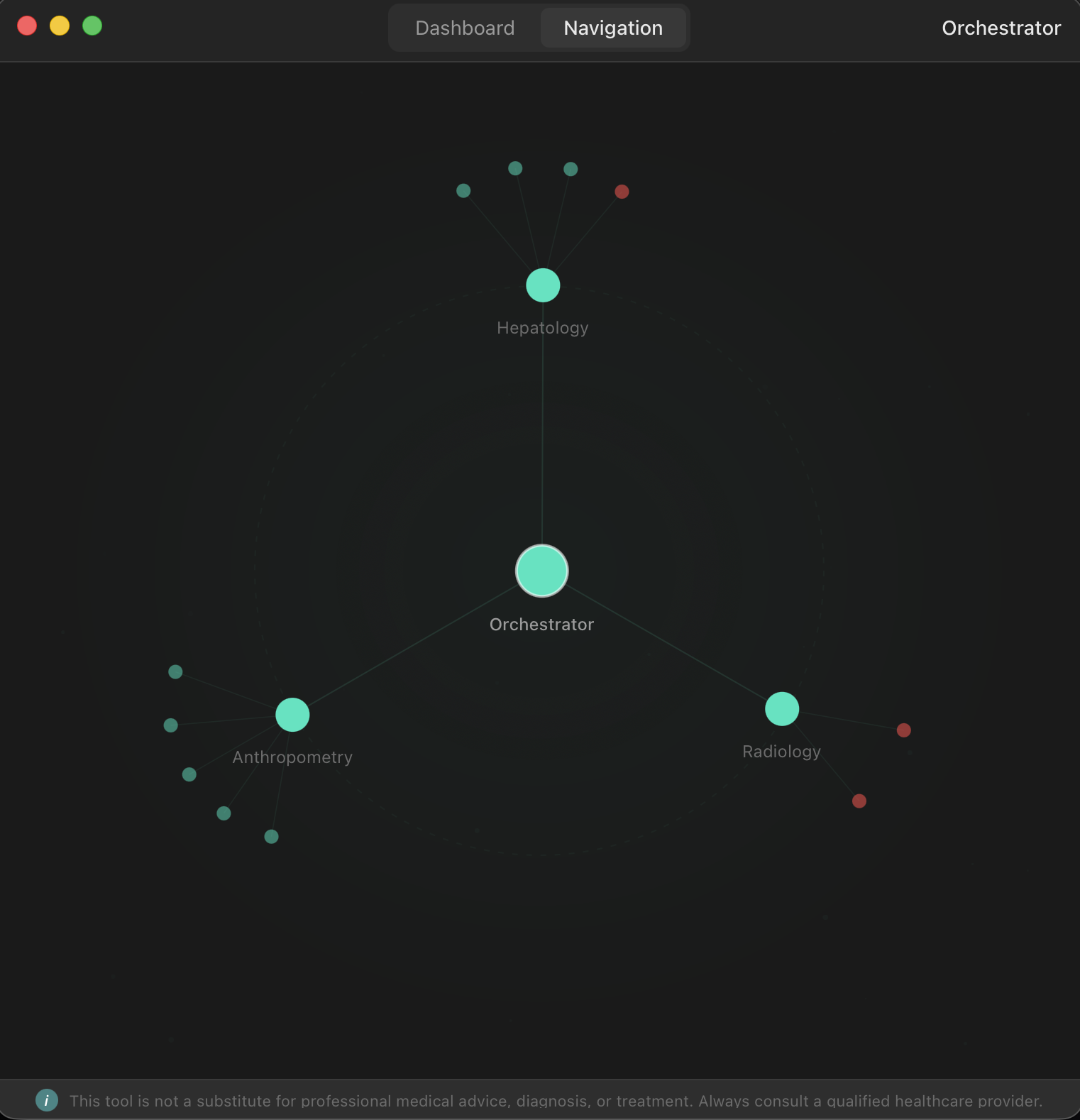 The Orchestrator sits on top of everything. It consumes output contracts from every node and performs cross-diagnostic analysis — the kind of pattern recognition that normally requires a specialist reviewing multiple reports side by side. Metabolic syndrome, for instance, requires correlating blood markers with body composition data. The Orchestrator handles that automatically.