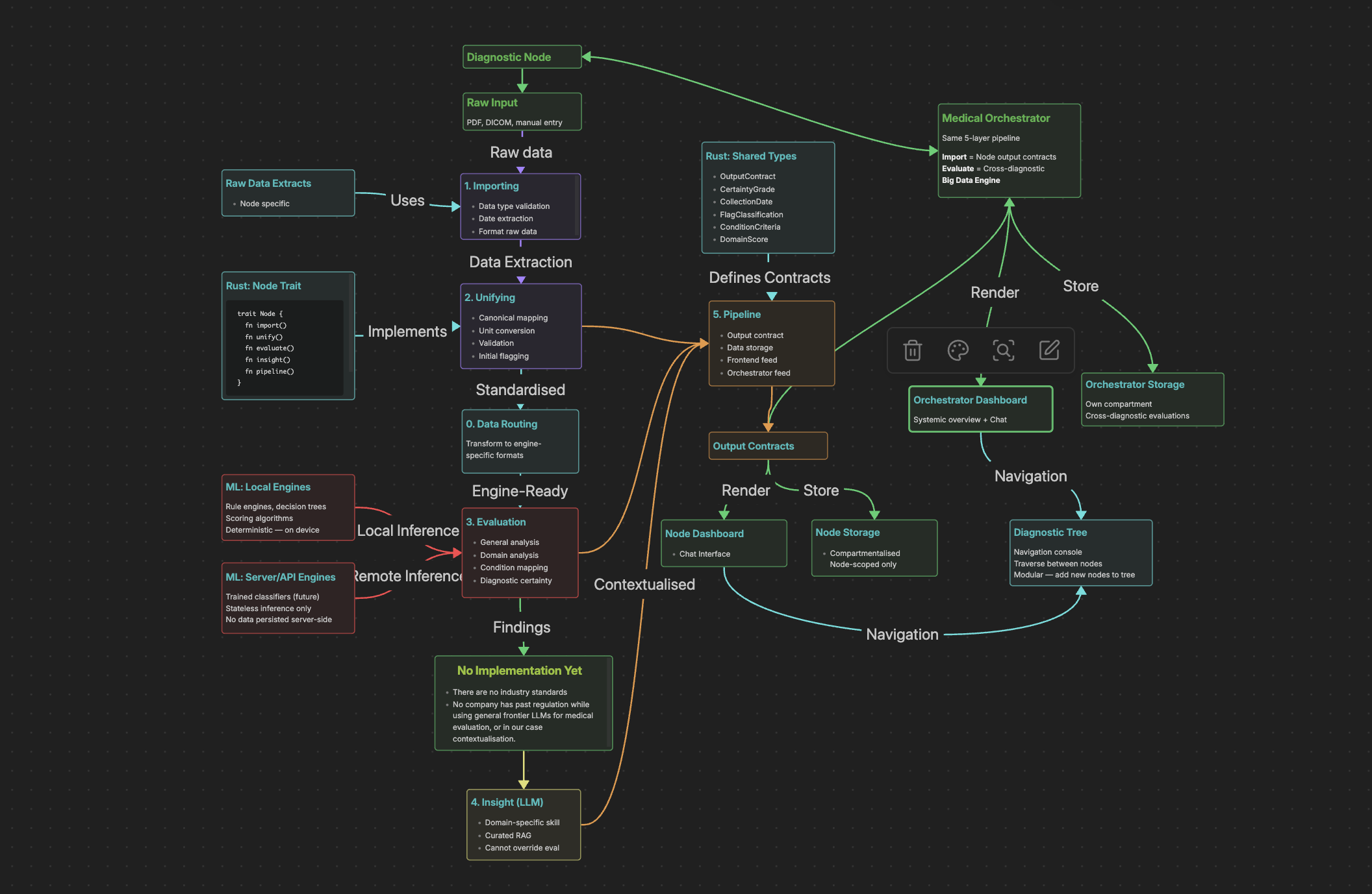 Any diagnostic domain, same architecture. This is the part that excites us most. The node model isn't specific to blood work or imaging — it's a general-purpose contract for diagnostic interpretation. The five-layer pipeline (import, unify, evaluate, insight, pipeline) and the output contract system mean that adding a new diagnostic domain doesn't require rethinking the architecture. It requires implementing the layers. Cardiology, dermatology, pulmonary function, genomics, audiometry — each of these is a node waiting to be built. The import layer learns to ingest that domain's raw data. The unify layer normalises it into typed structs. The evaluation layer runs validated scoring. And the Orchestrator immediately gains the ability to cross-reference that new domain against everything else. A cardiology node doesn't just give you cardiac analysis — it gives the Orchestrator the ability to correlate cardiac findings with liver enzymes, imaging results, and body composition in ways that would normally require a multidisciplinary team. The modularity isn't a nice architectural property. It's the scaling strategy. Every new node makes every existing node more valuable, because the Orchestrator sees further with each domain it can draw from. And because the trait contract is language-agnostic — a node can implement its layers in Rust, Python, or anything else — the barrier to adding a new domain is domain expertise and validated models, not engineering rework.