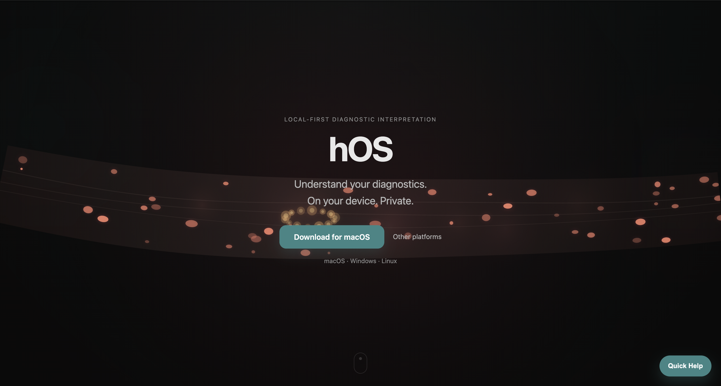 hOS is a local-first desktop application that ingests raw diagnostic data — blood work PDFs from pathology labs, medical images like chest X-rays, and body composition measurements — and runs deterministic, auditable analysis entirely on your machine.