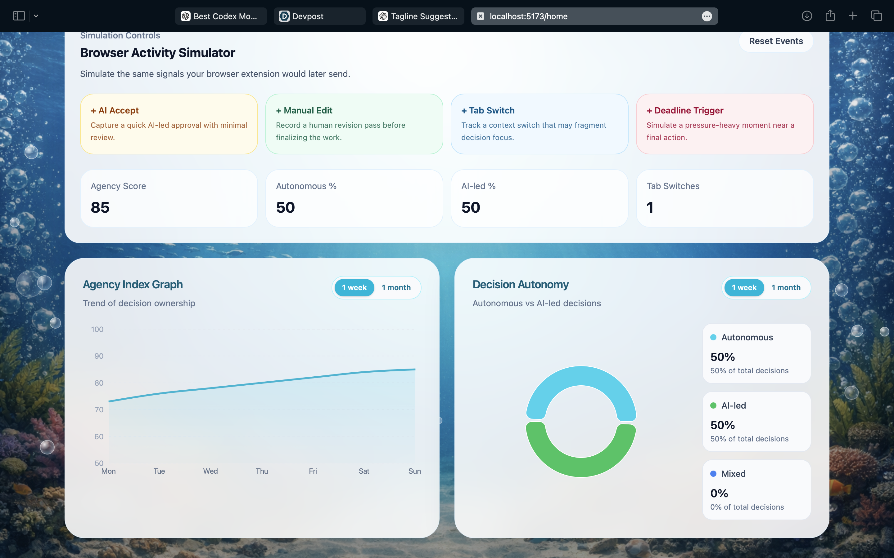 We also take pride in designing a unique deep-sea themed interface that visually represents the concept of depth in intelligence, making the experience both engaging and meaningful. Lastly, we were able to fetch the activity on platforms which helped us to calculate agency index.
