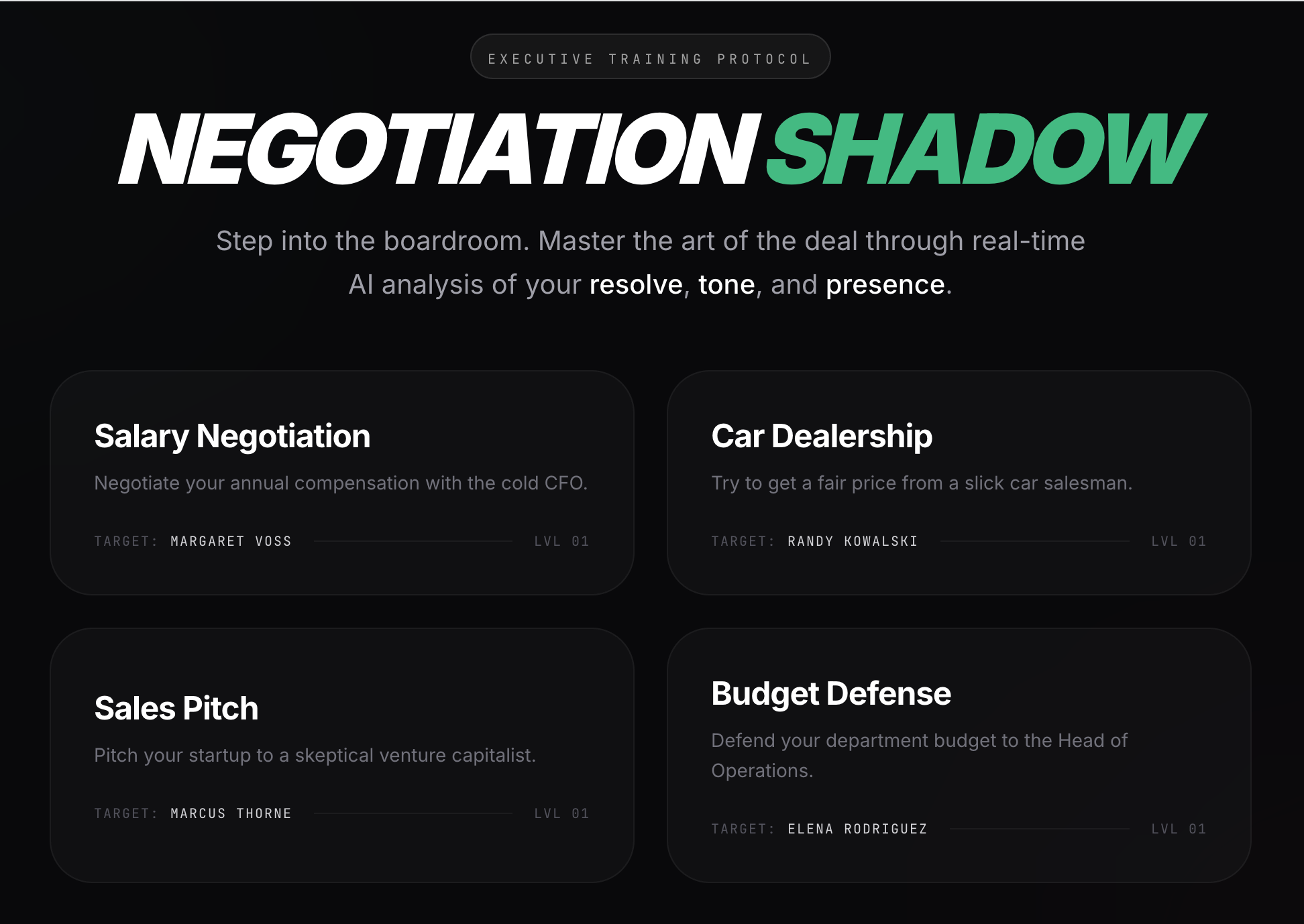 NegotiationShadow is an AI-powered executive training simulator. Users face off against various "Boss" personas—from a cold CFO to a slick car salesman.