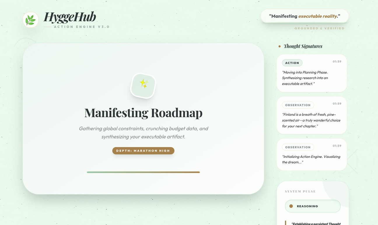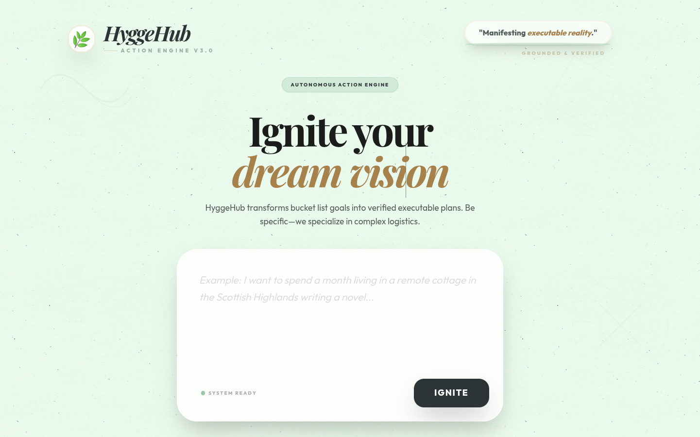 HyggeHub is an autonomous Life-Orchestrator that transforms "someday" dreams into "right now" roadmaps. Unlike generic chatbots that just provide text, HyggeHub creates a persistent Action Artifact—a structured plan complete with visual vision grounding, a professional budget strategy, and a multimodal verification loop. By using Gemini to analyze real-world evidence of your progress, HyggeHub acts as a grounded partner in manifestation, ensuring your goals move from the screen into the physical world.