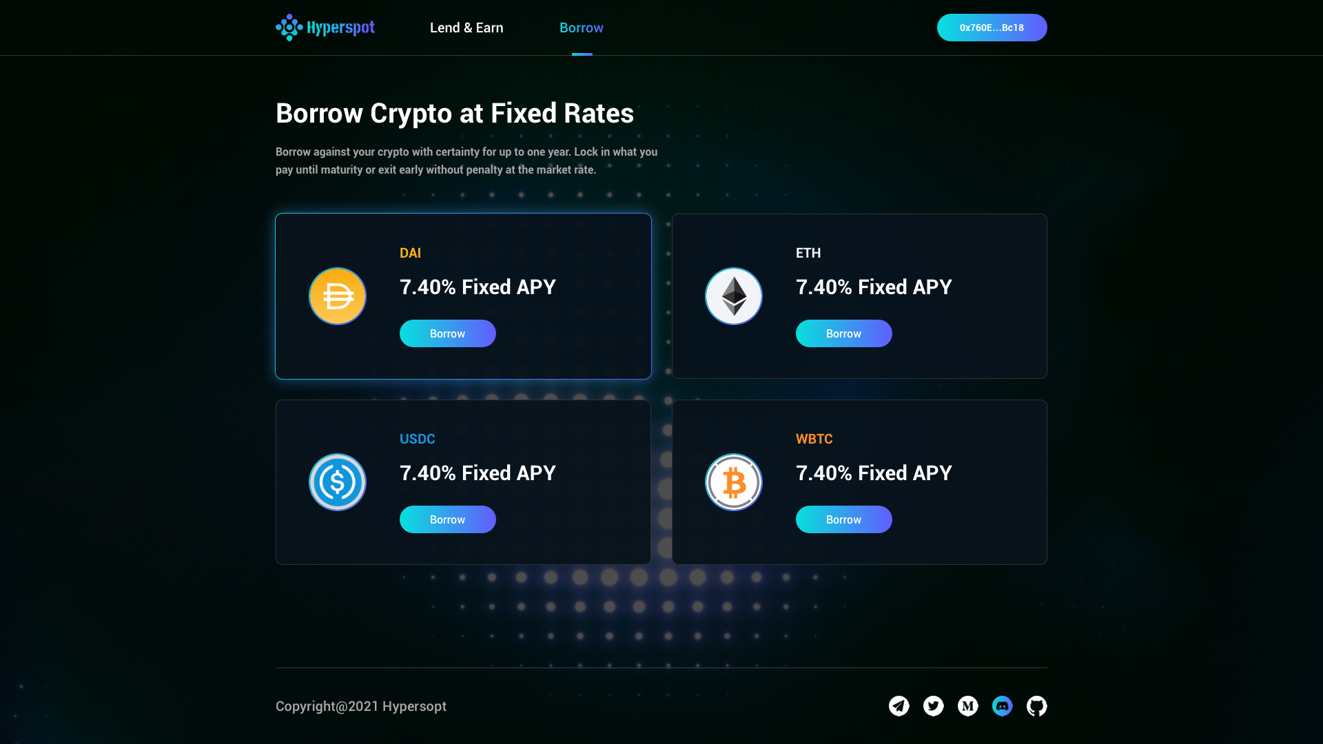 Eliminate financial intermediaries through the Ethereum blockchain and provide secure and efficient fixed-rate loans to anyone in the world. System integrity is ensured through strict risk management of protocol reserves and protocol governors. Hyperspot will be the safest place to earn fixed returns in DeFi.