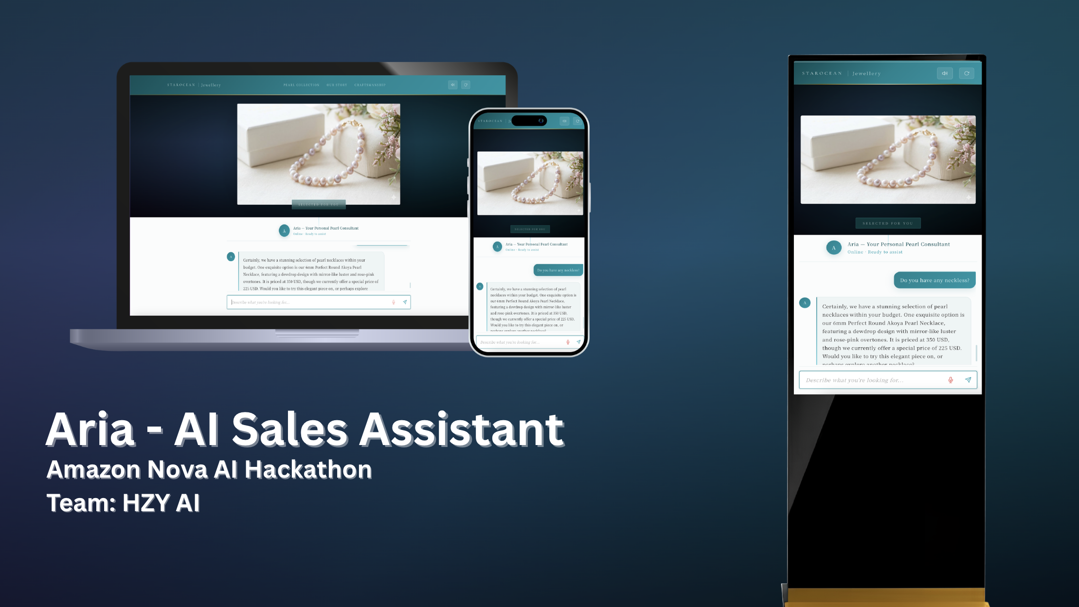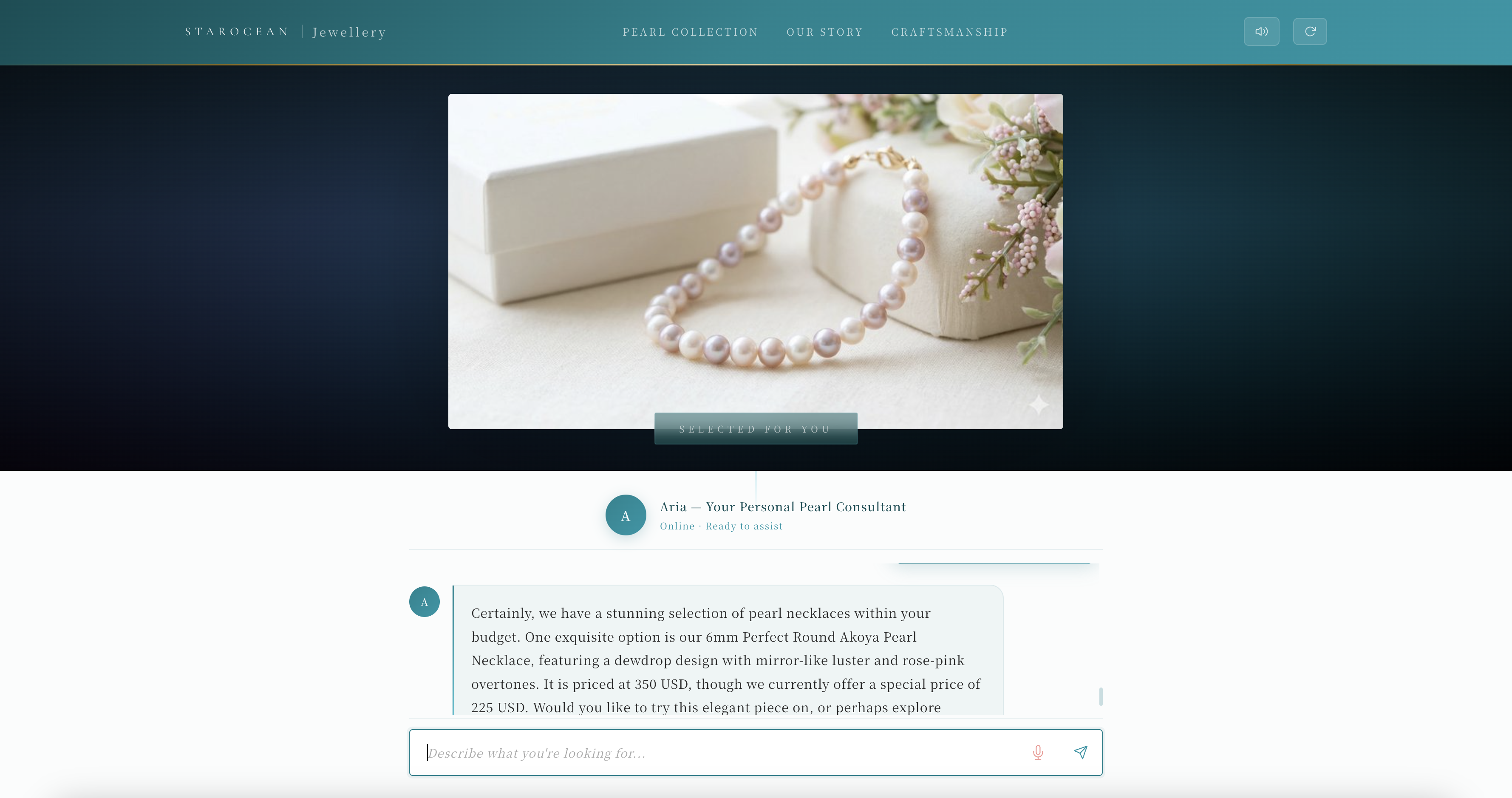 Aria is an AI-powered pearl jewelry sales consultant that combines multimodal understanding with retrieval-augmented generation (RAG) to deliver a luxury shopping experience:
