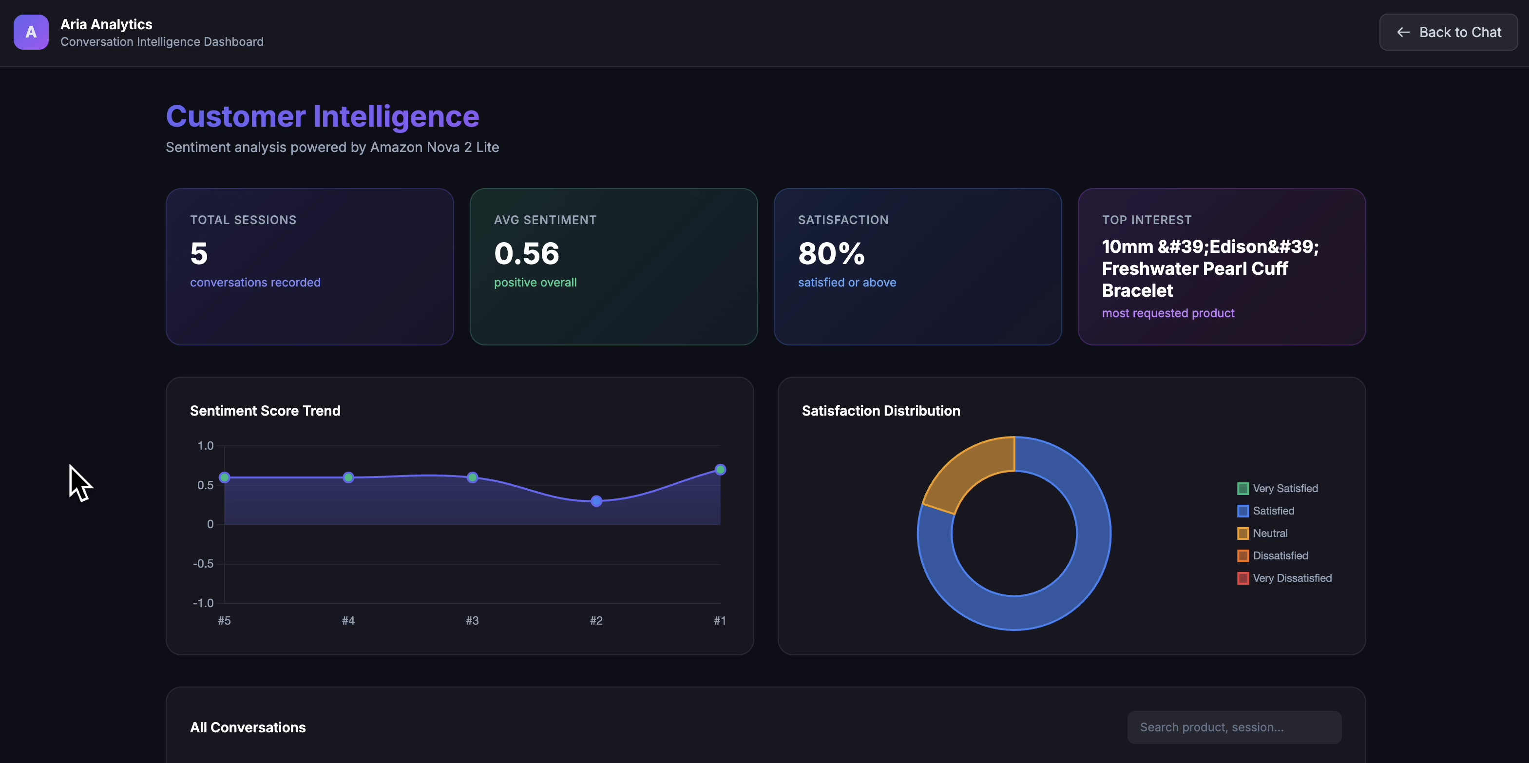 - Analyzes customer sentiment in real-time using Nova Lite, tracking satisfaction and product interest across conversations