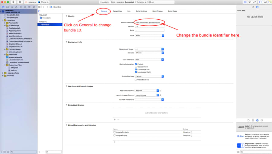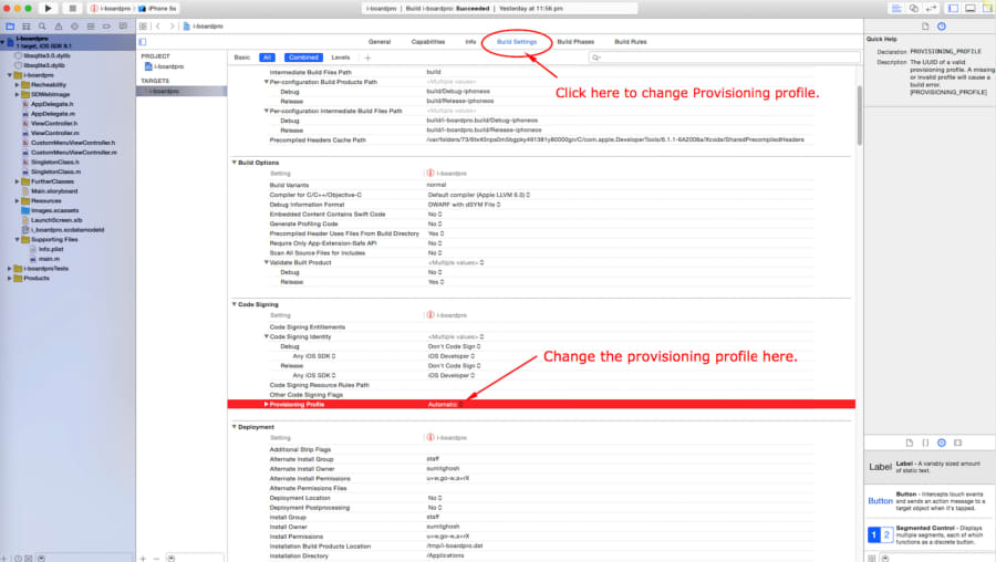 - Click on General , set the proper Bundle Identifier and go to Build settings menu, change Provisioning profile under Code Signing.