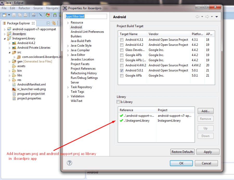 - Select iboardpro, instagram library and android support library.