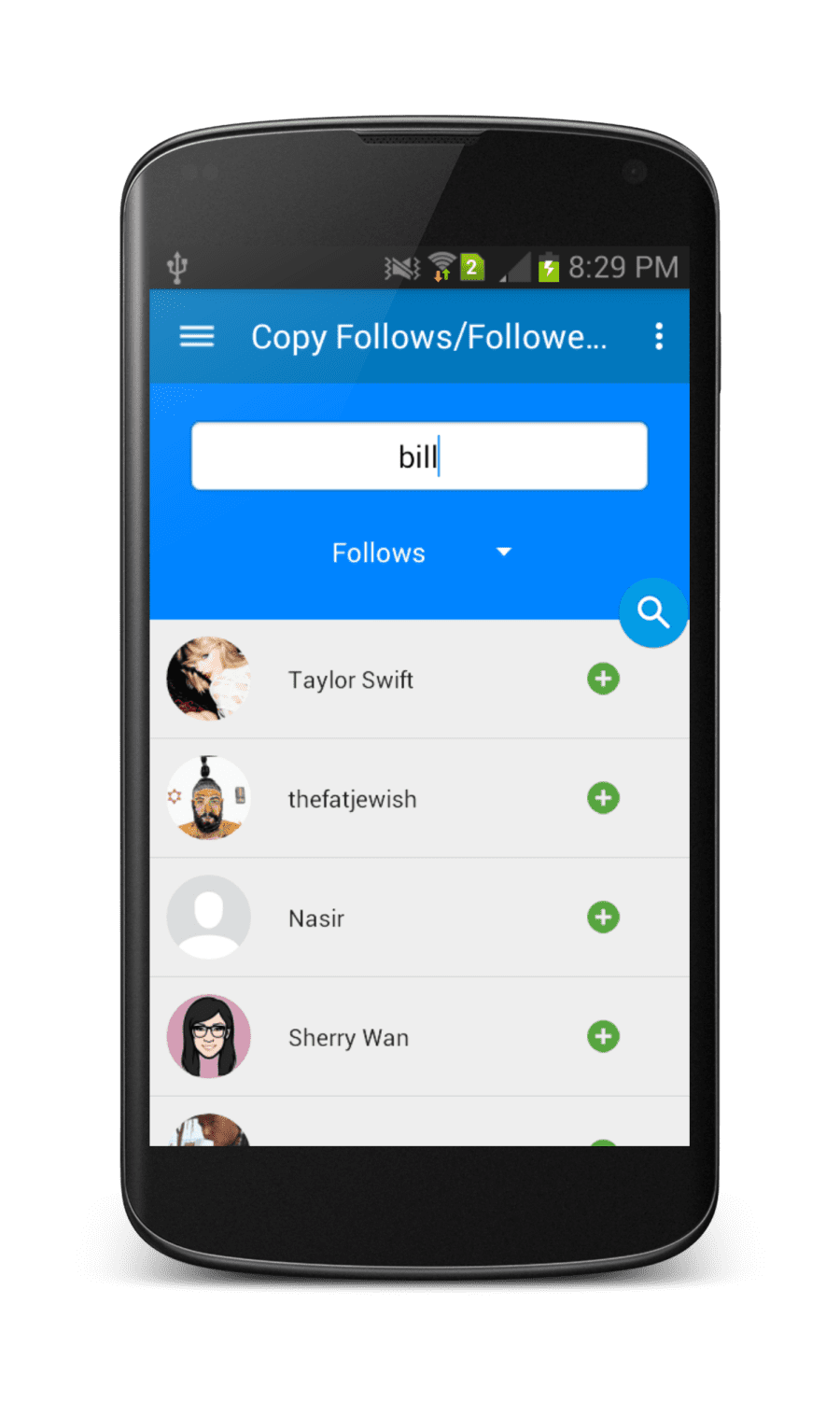 CopyFollowers/Follwed-by: Search any user by typing username and get all his/her followers and follwed-by list, then copy to your list by just typing on follow button.