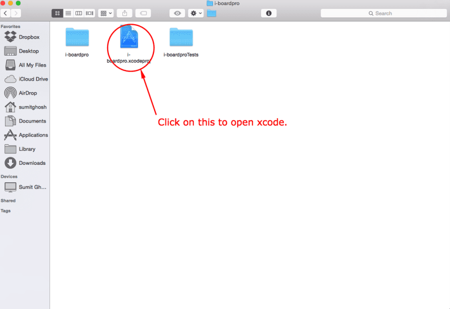 - Open the i-boardpro folder,you will find i-boardpro.xcodeProject file and double click on that folder to open Xcode.