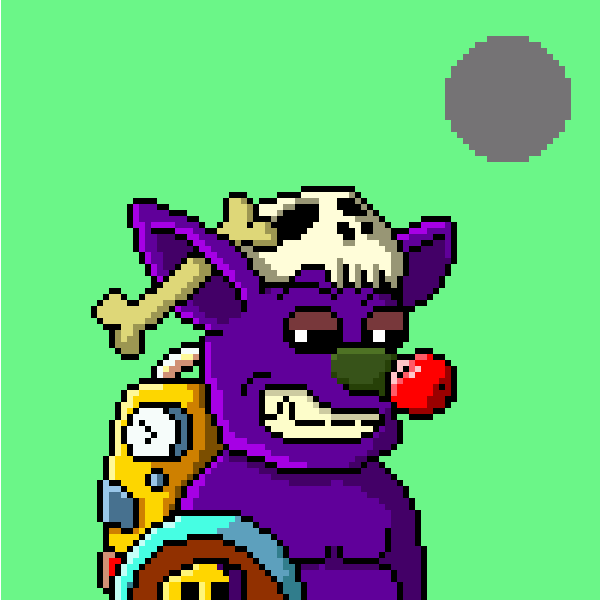Purple body, skull cap, clown nose, etc with solid background and new moon