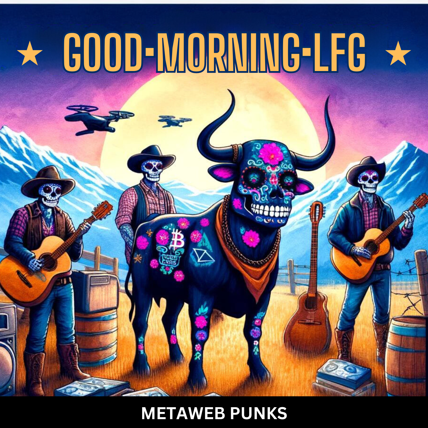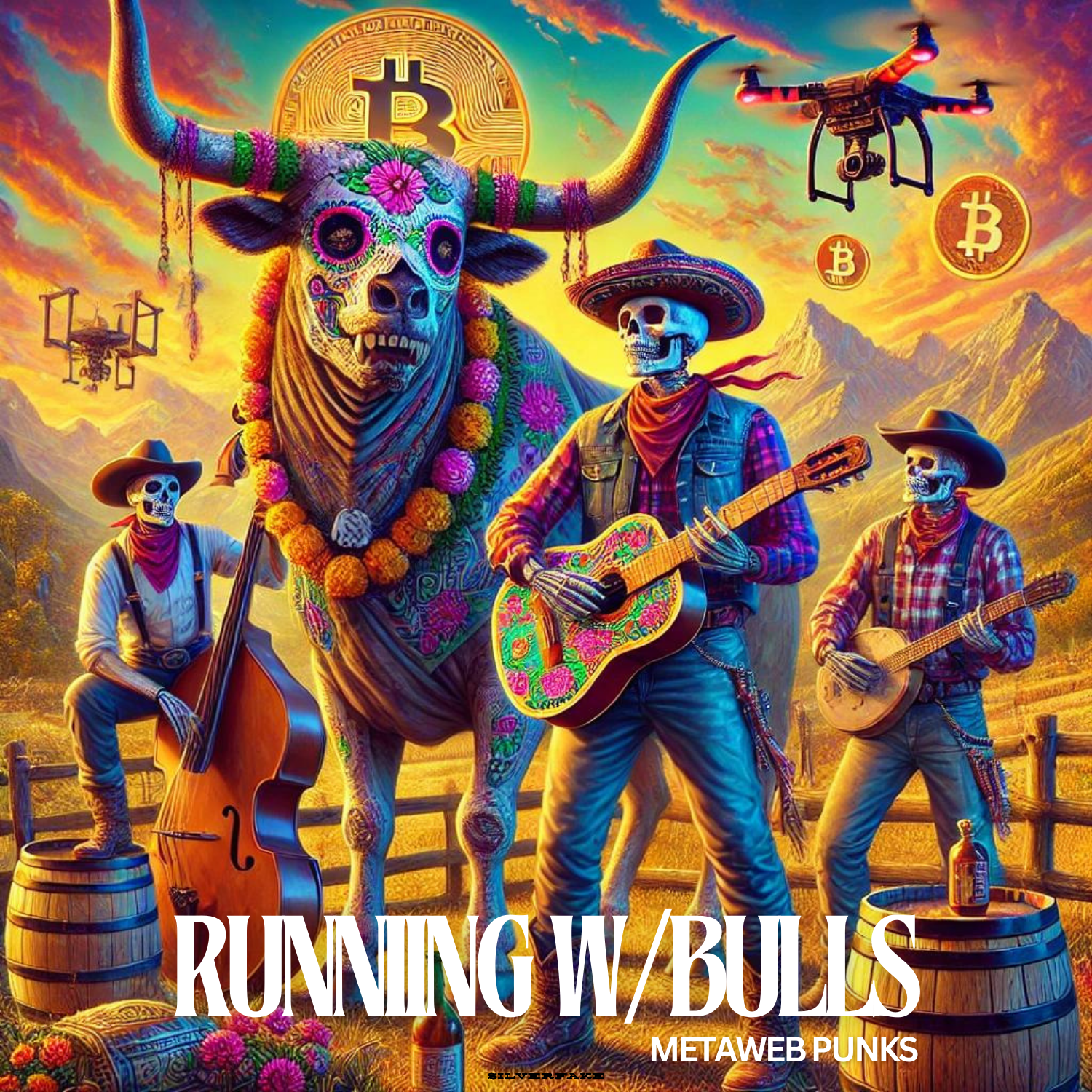 This project uses music, video, an ordinal book, and several ordinal collections—created with DMT (Digital Matter Theory)—to draw people to Bitcoin. We created a 13-track album of Bitcoin-aligned music called "Running w/Bulls," and an EP with 7 versions of the "Good Morning LFG" song. Several seminal graphics surrounding the famous $DOG photo establishes Pacha as $DOG's human companion.